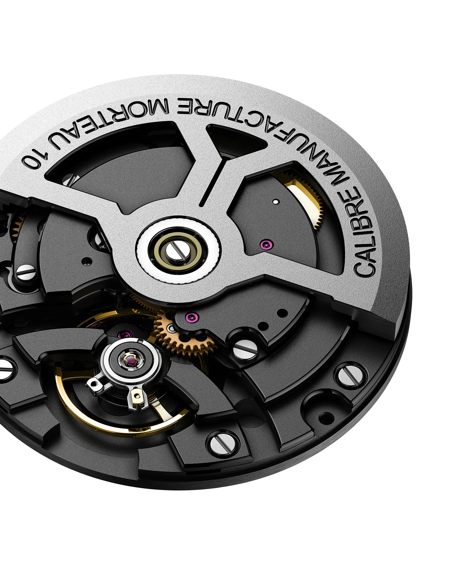 に設計および開発された調節機構はスイスで製造され、ブリッジとメインプレートはモル