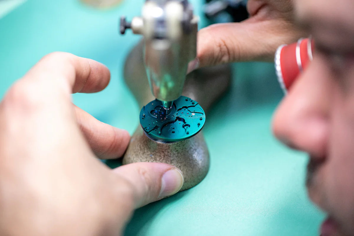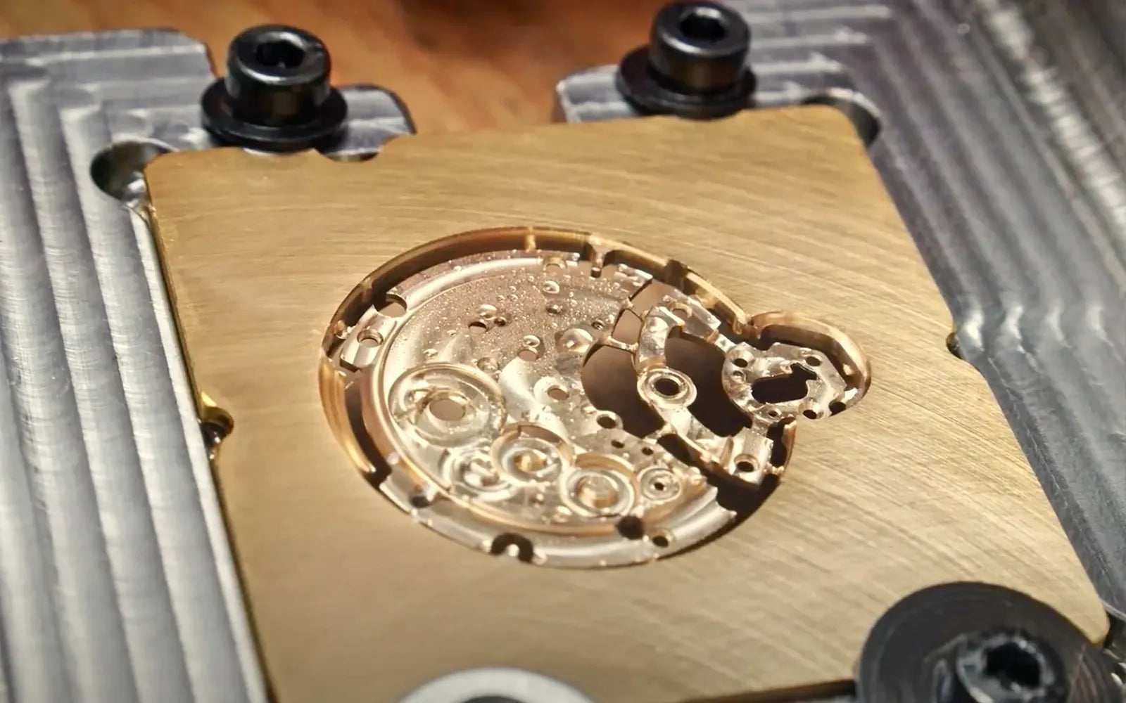 CMM.20は、革新的な新世代の高性能キャリバーとして設計されました。キャリバーの現代的な外観を強化するために、ブリッジとプレートに黒のガルバニック装飾を施した、モダンで差別化された美学を選択しました。主プレートとブリッジのマイクロブラスト処理は、サンドブラスト機を使用して施され、中性でマットな表面仕上げが得られます。これは、振動する重りの「ガンメタル」仕上げと対照的です。均一な黒のガルバニックコーティングが、装飾的なマイクロブラスト仕上げを保持します。