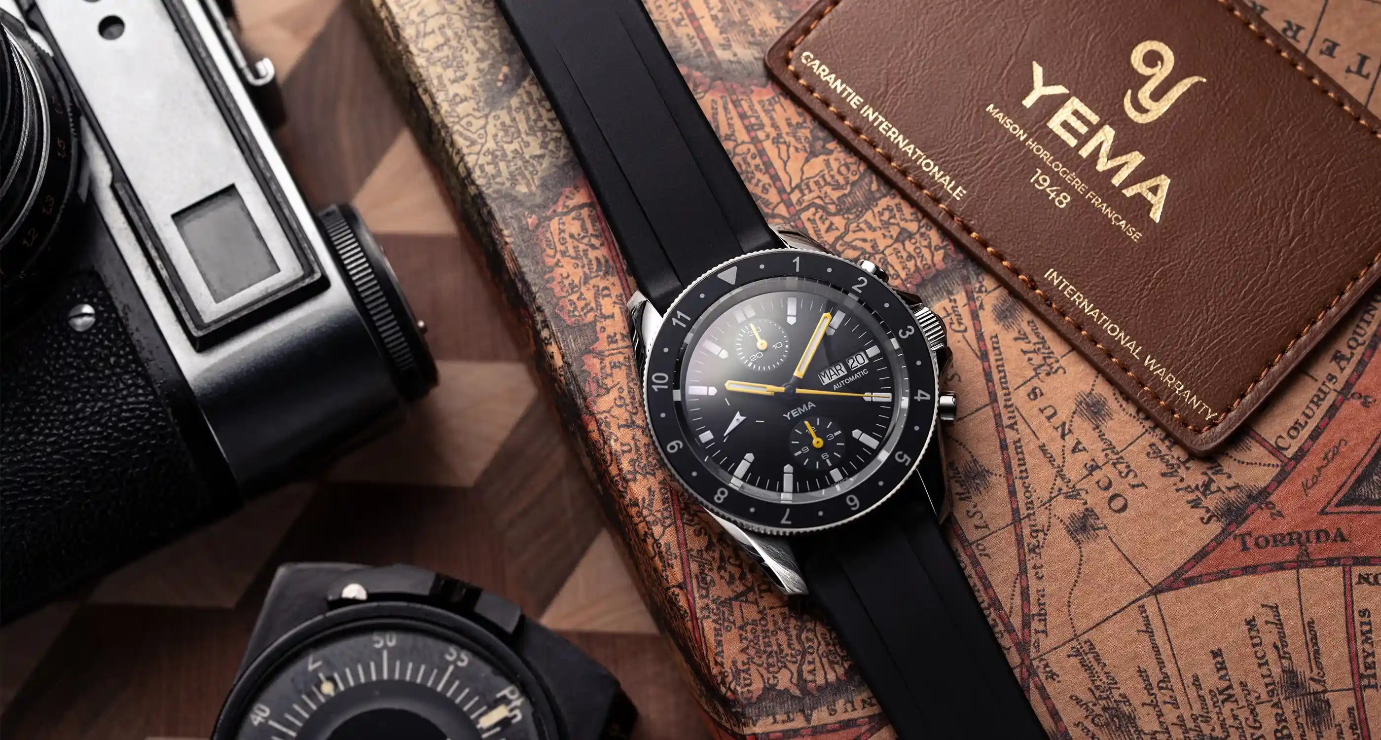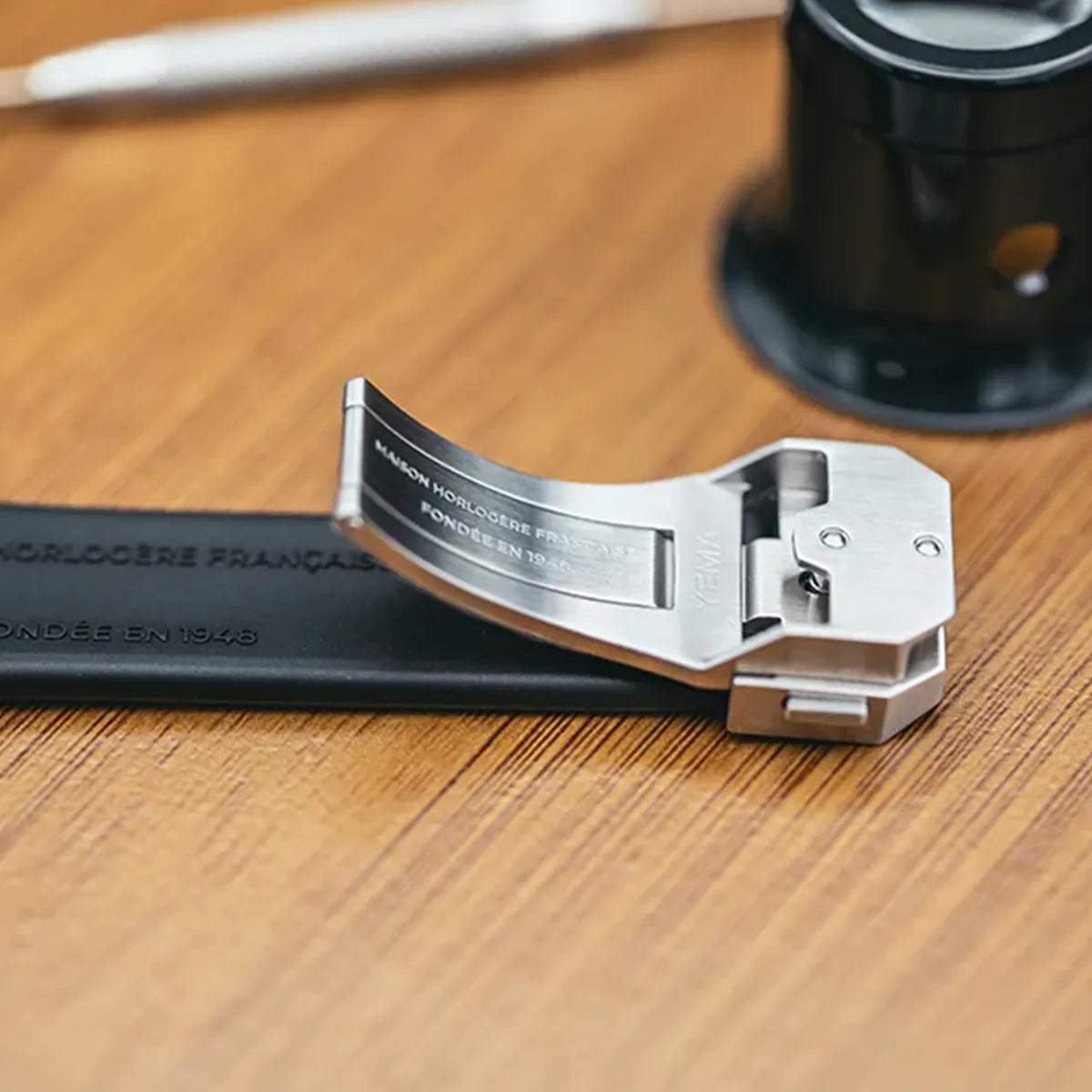 ています。イエマのロゴとフランスの時計製造1948年の文字がエレガントに刻印されています。
