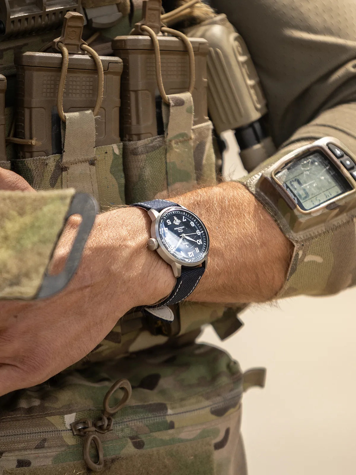 フランス航空宇宙軍の特殊部隊である、CPA10が掲げたミッションは明確かつ直接的でした。それは時計に部隊カラーを用いること、そして彼らの価値観である卓越性と精密性を、真正に体現する時計を製造することでした。一般向けモデルに加えて、CPA隊員専用に100本を超える刻印と個人仕様が施された時計が特別に製造されました。