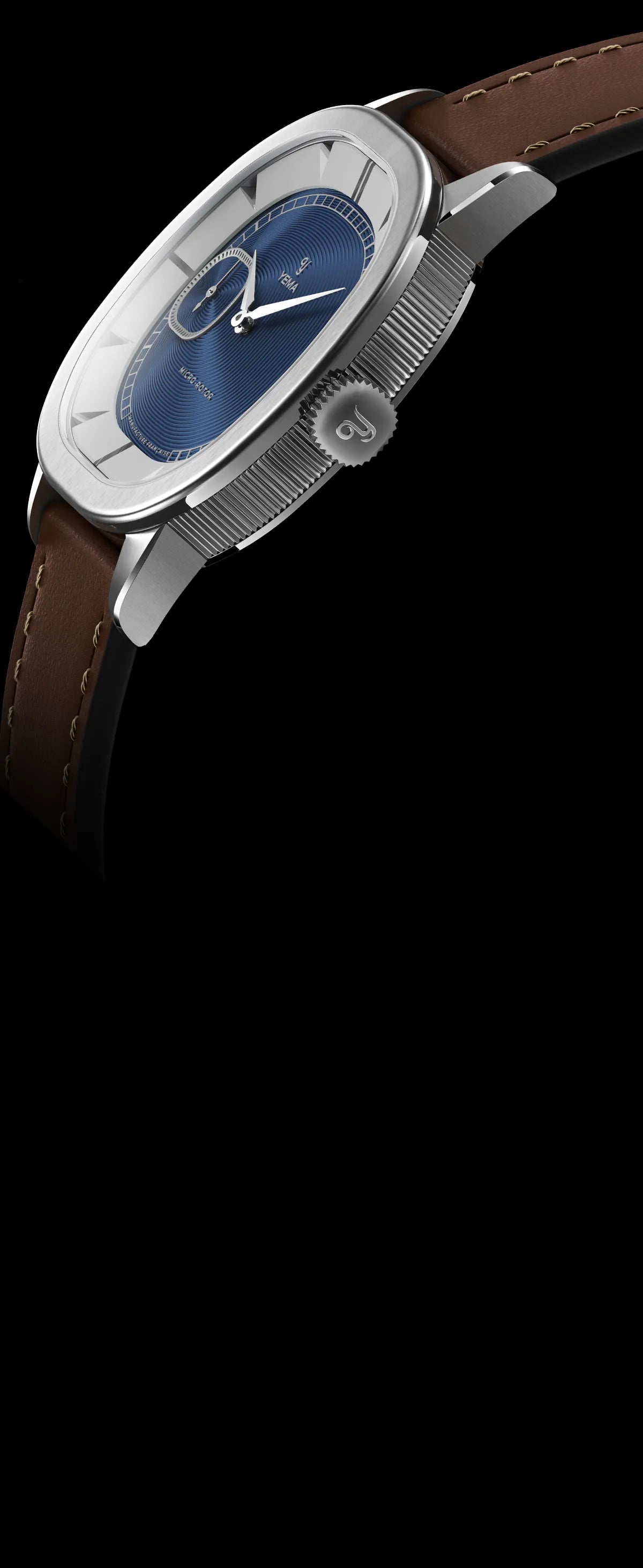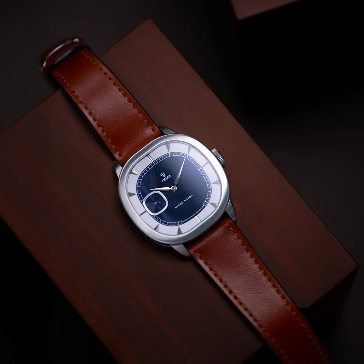 ブラッシュ仕上げのステンレススチール製ケースには、側面に垂直コインエッジと面取り部分には鏡面仕上げの加工を施しています。サイズ8..6mmのスリム薄型ケースはあらゆる角度からの光をとらえ魅力的な輝きを放ちます。YEMAの歴史的ロゴ「Y」を刻印したクッション型リューズは、真正性と独創性を象徴するものです。