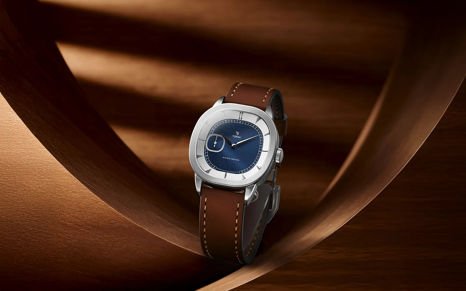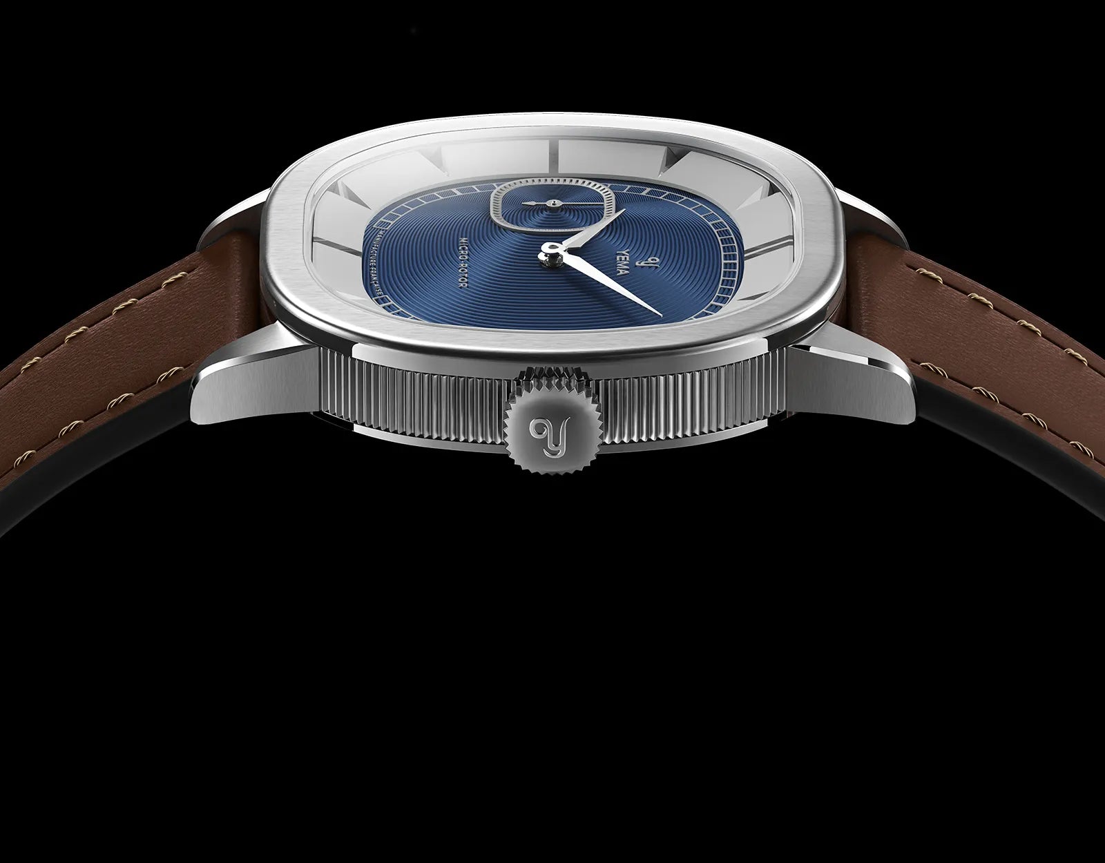 39mmクッション型ケースは、YEMAが工房を構えるフランス時計製造の聖地ブザンソンに佇むグランヴェル宮殿のアーチ構造をモチーフに設計されました。