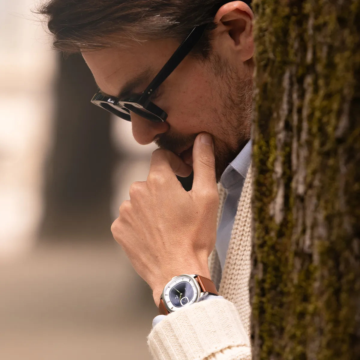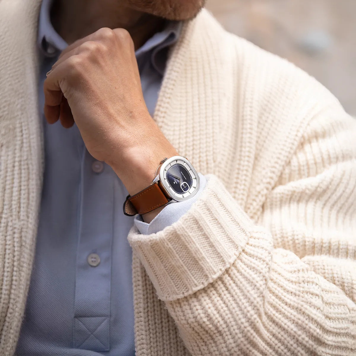 グランヴェルには、ラグからバックルにかけて徐々に細くなるプレミアムレザーストラップが組み合わされており、上品なアクセントとなるベージュのコントラストステッチが施されています。エレガントで耐久性に優れ、高品質なステンレススチール製のディプロイメントバックルを備えたこのストラップは、ケースのトーンと調和しながら、日常の装着においても快適さを長く保ちます。