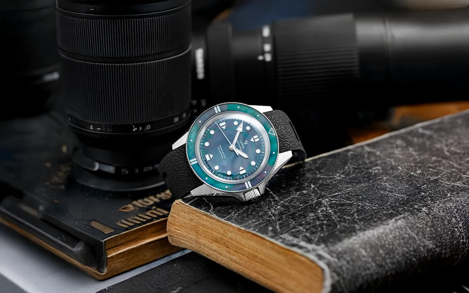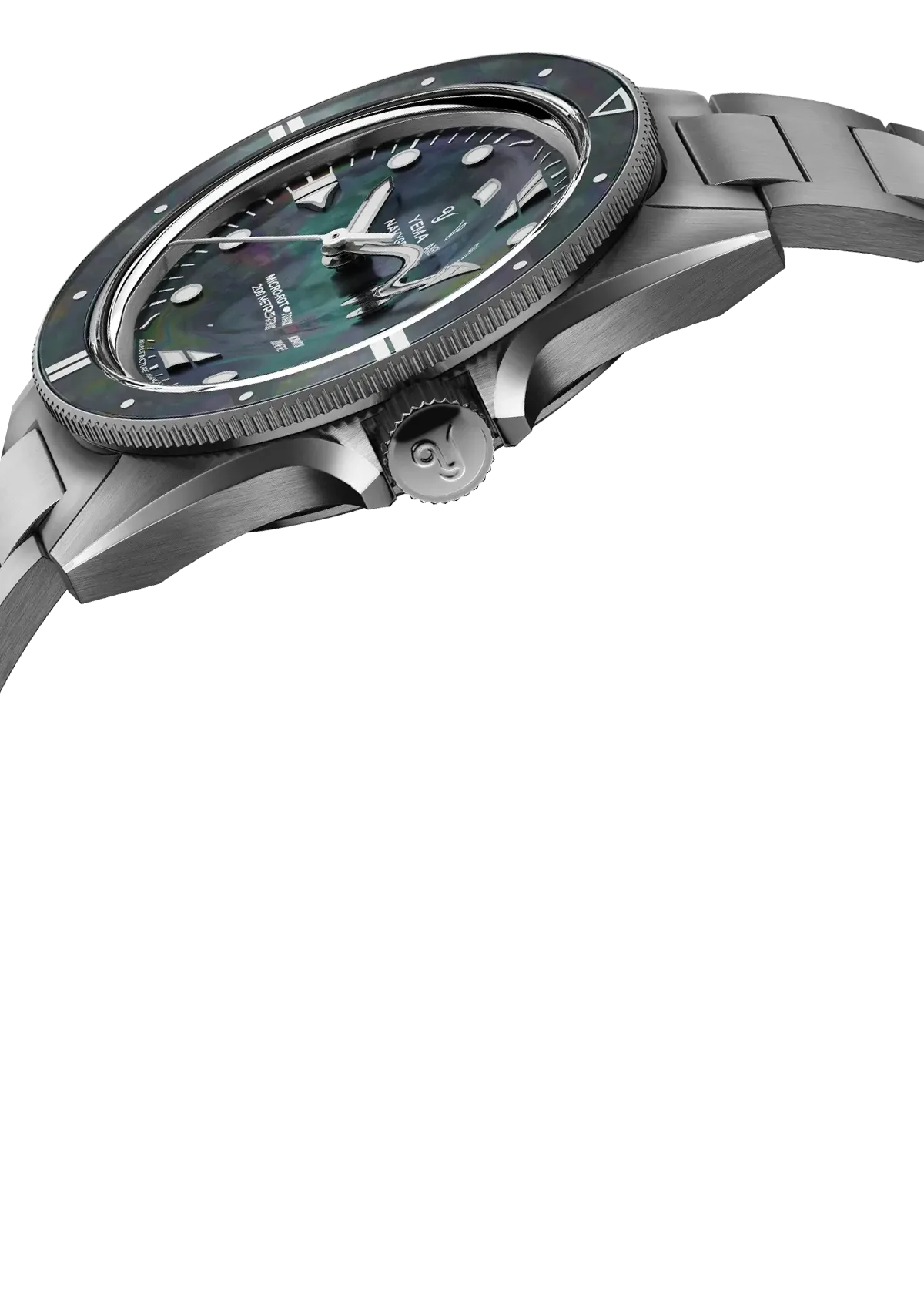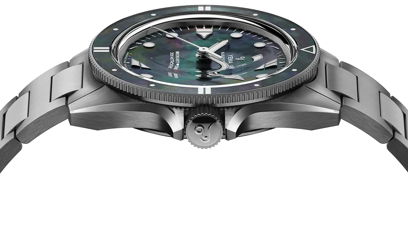 同じ天然素材のマザーオブパールをベゼルと文字盤の両方に使用することで、洗練された美しさがより強調されています。また自然界を思わせる繊細な質感を途切れることなく使用することで、時計の輝きが一層引き立っています。その繊細な美しさを保つために、ベゼルは樹脂コーティングで保護され、傷に強いダブルドーム型のサファイアクリスタルが上部に施されており、あらゆる角度から奥行きと透明感を際立たせています。これらの要素が一体となって、洗練された美学と妥協のない耐久性が見事に共存しています。