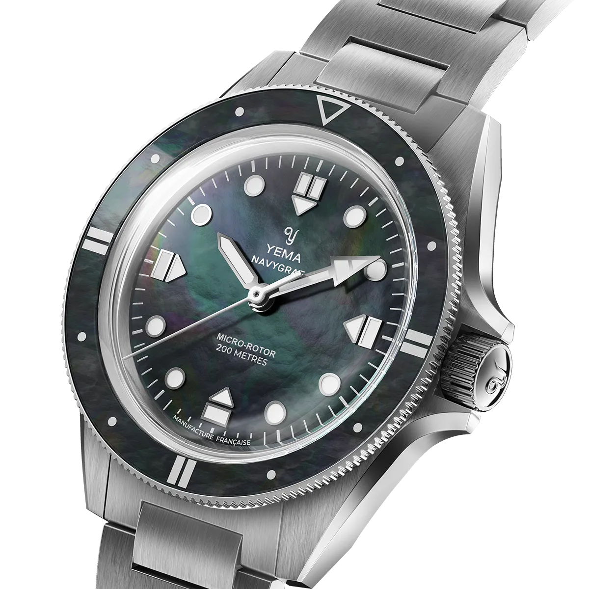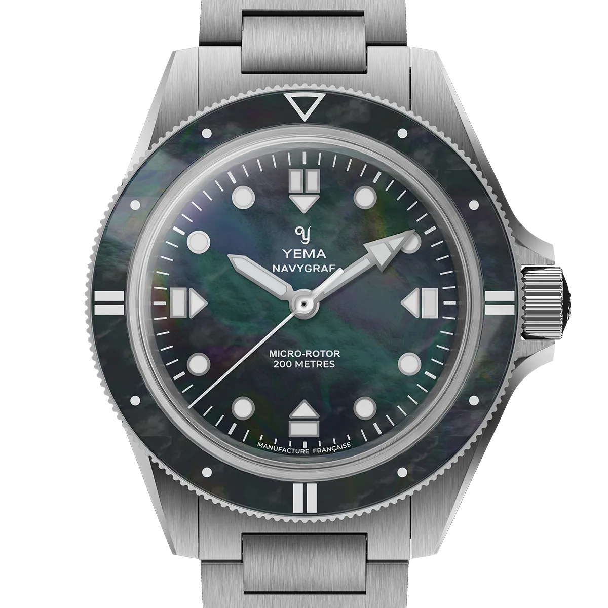 自社製マイクロローター・キャリバー「CMM.20」を搭載したこちらのモデルは、歴史的なネイビーグラフをよりスリムに再解釈してデザインされました。完全に再設計された39mmの薄型ケースには上品な仕上げが施されており、文字盤とベゼルにはマザー・オブ・パールを採用しています。文字盤は傷に強いダブルドーム型サファイアクリスタルにより保護されています。新解釈により誕生したスリムで汎用性の高いこちらのネイビーグラフは全ての手首のサイズに自然にフィットし、フォーマルな装いの中にエレガントな印象を演出します。