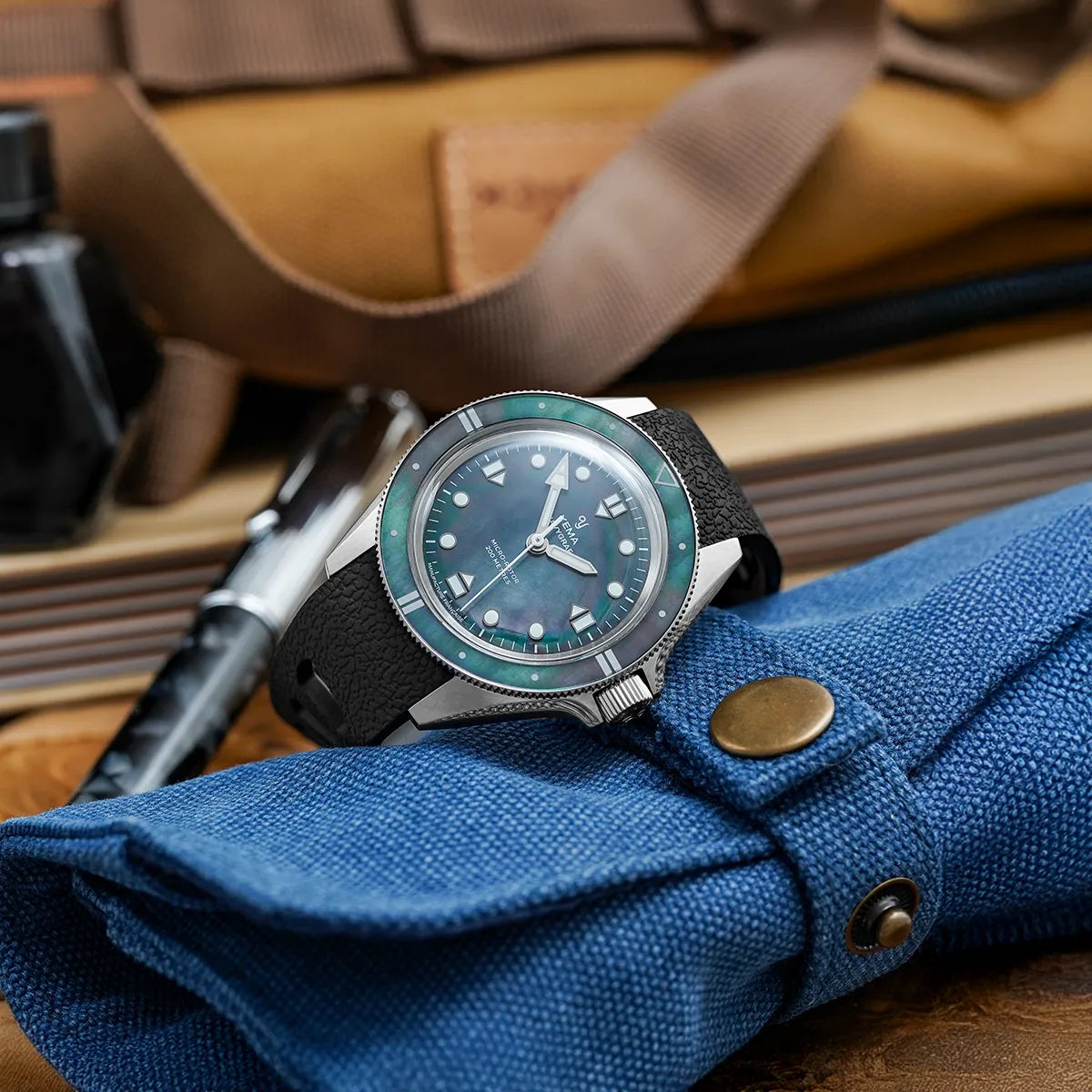 こちらのFKMラバー製パーフォレーテッドストラップは、ネイビーグラフのラグに自然にフィットするよう特別にデザインされています。独特の質感とシルエット、そしてレトロな美しさが際立つデザインです。