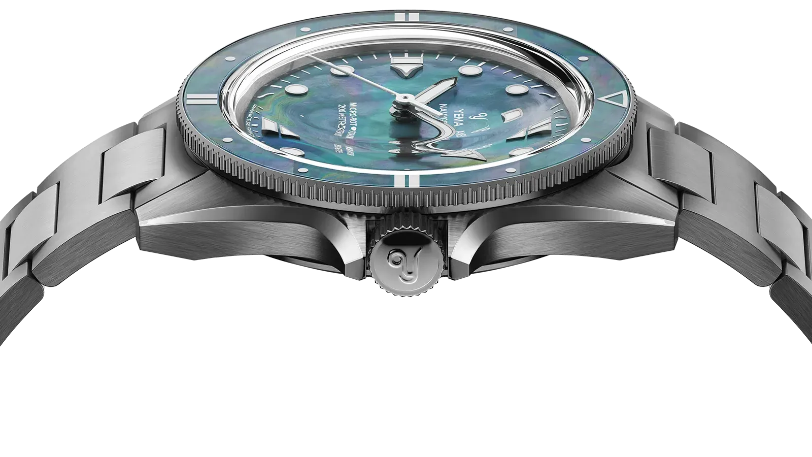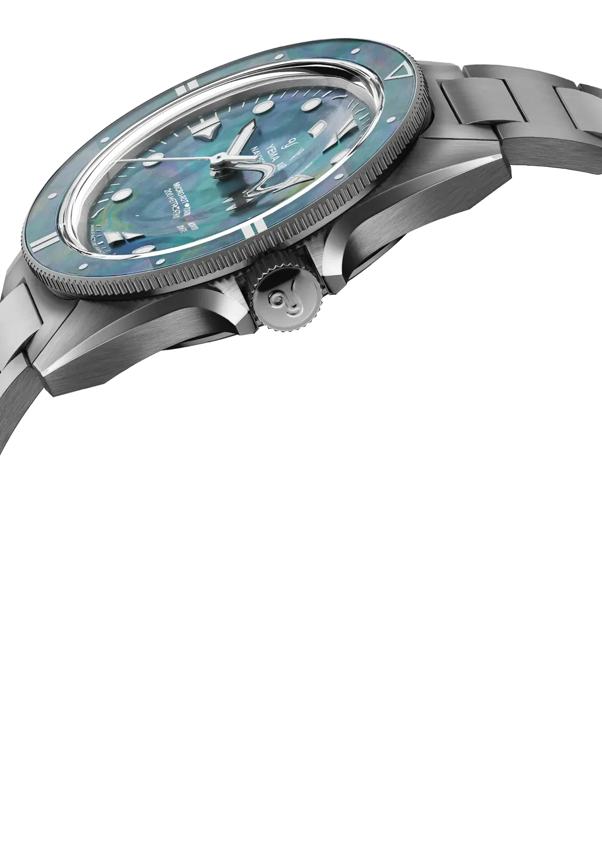 同じ天然素材のマザーオブパールをベゼルと文字盤の両方に使用することで、洗練された美しさがより強調されています。また自然界を思わせる繊細な質感を途切れることなく使用することで、時計の輝きが一層引き立っています。その繊細な美しさを保つために、ベゼルは樹脂コーティングで保護され、傷に強いダブルドーム型のサファイアクリスタルが上部に施されており、あらゆる角度から奥行きと透明感を際立たせています。これらの要素が一体となって、洗練された美学と妥協のない耐久性が見事に共存しています。