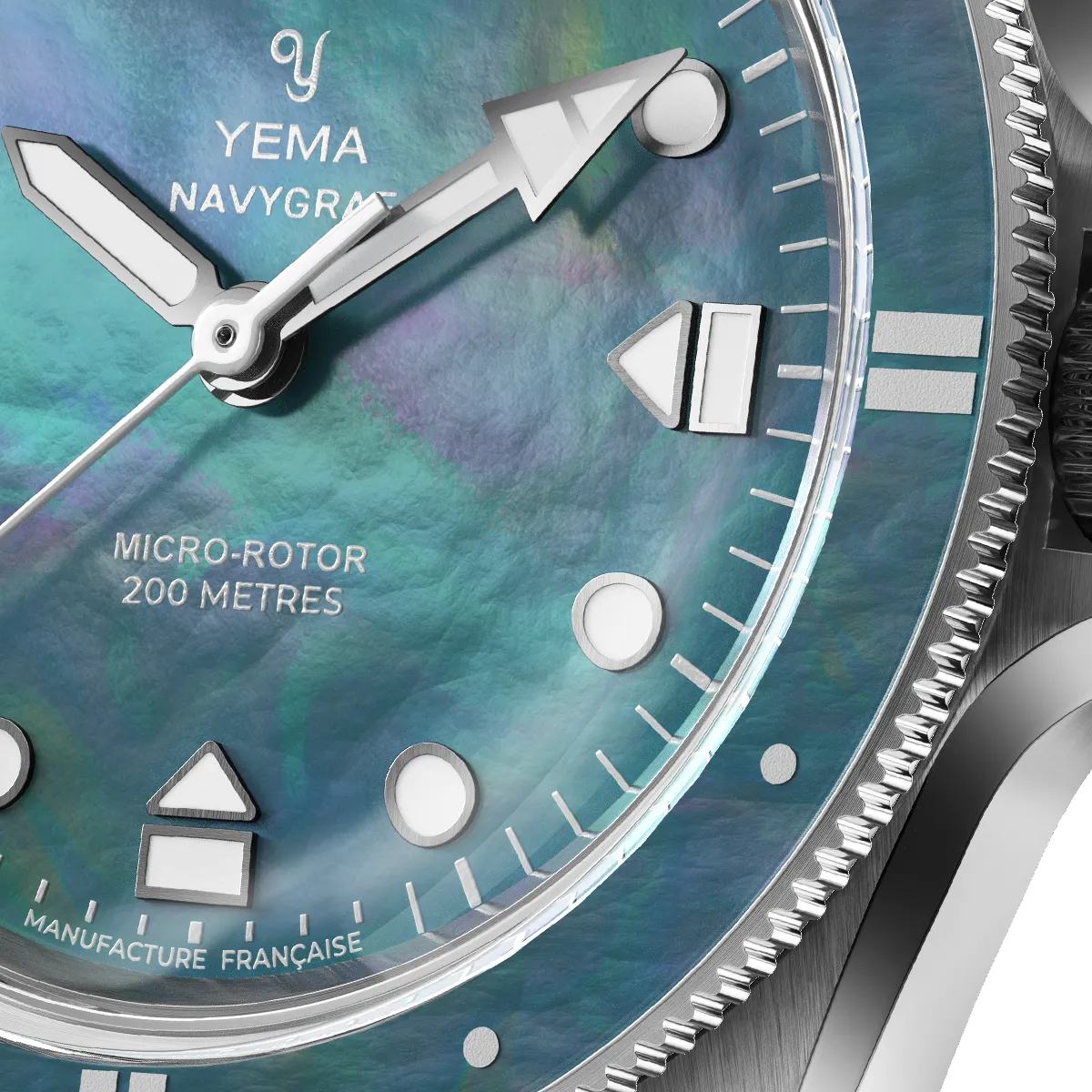 樹脂コーティングを施した一方向回転式マザーオブパール製ダイビングベゼル。