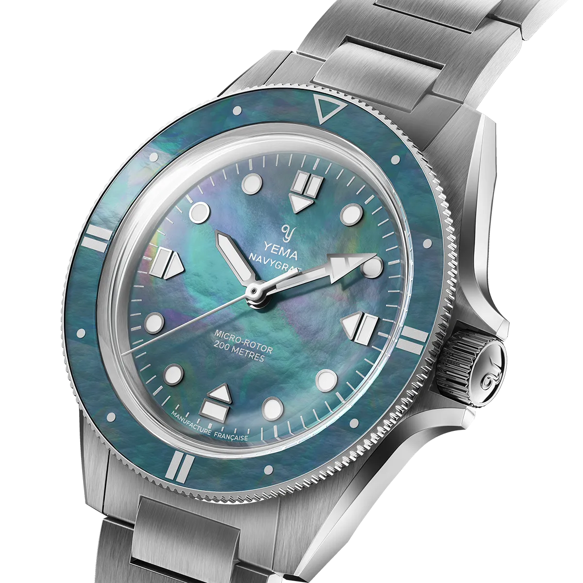 ポリッシュ仕上げの立体的なスチール製インデックスは、スチール製の時針と分針と美しく共鳴して、見る角度によってマザーオブパールの文字盤に金属の美しい反射を生み出します。
