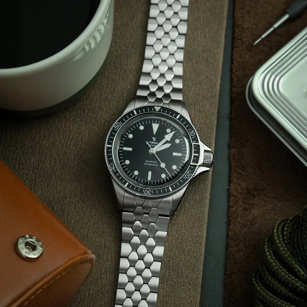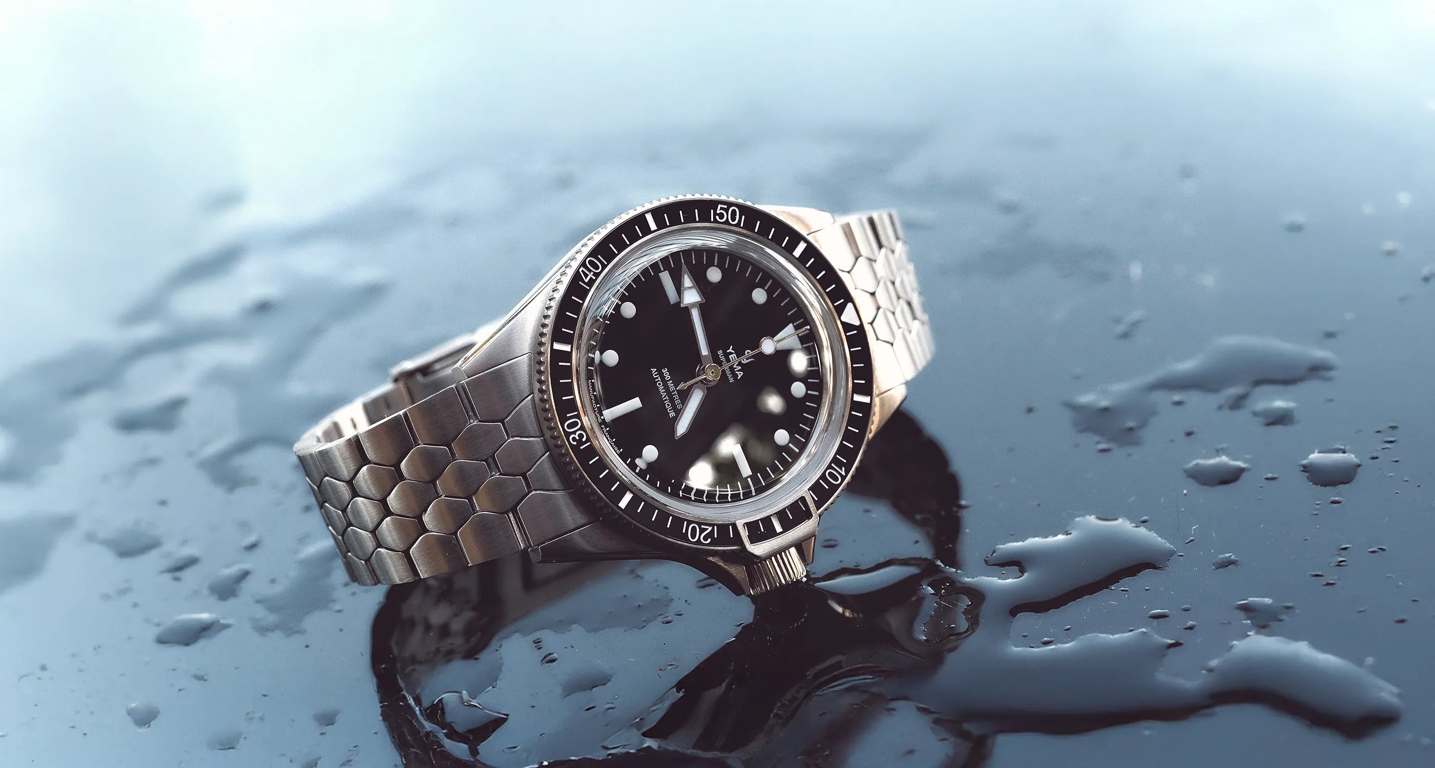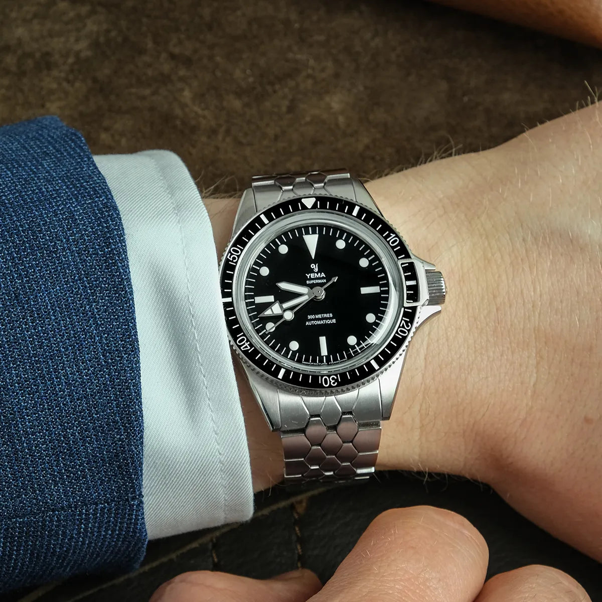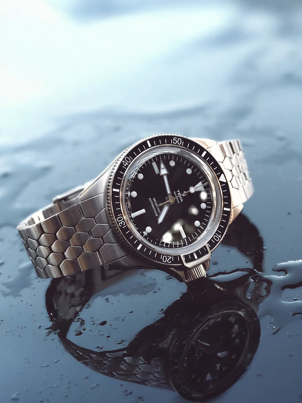 1960年代のアイコニックなイエマスケールブレスレットは、スーパーマン・スティールCMM.10の洗練されたケースに合わせてサイズが0.40mm分サイズダウンしています。