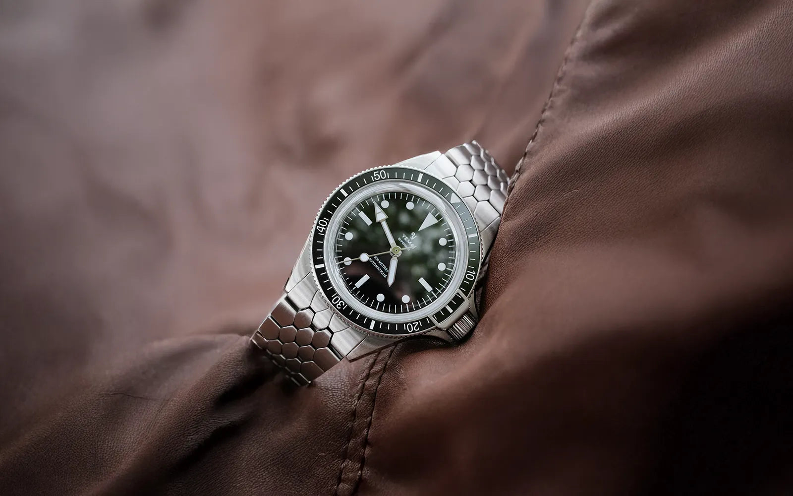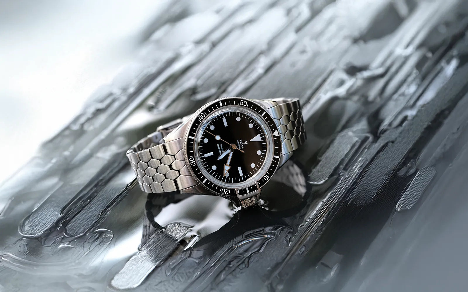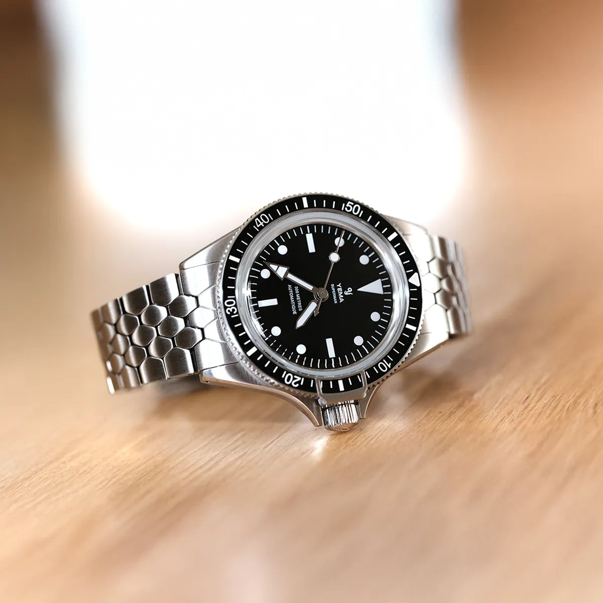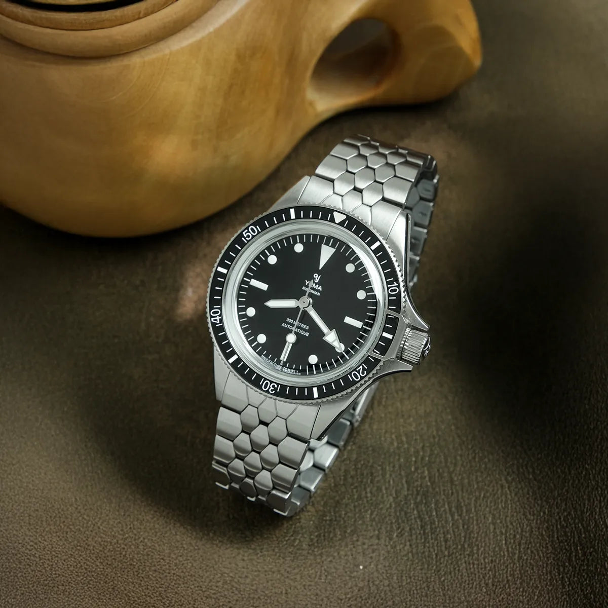 1960年代のアイコニックなイエマスケールブレスレットは、スーパーマン・スティールCMM.10の洗練されたケースに合わせてサイズが0.40mm分サイズダウンしています。