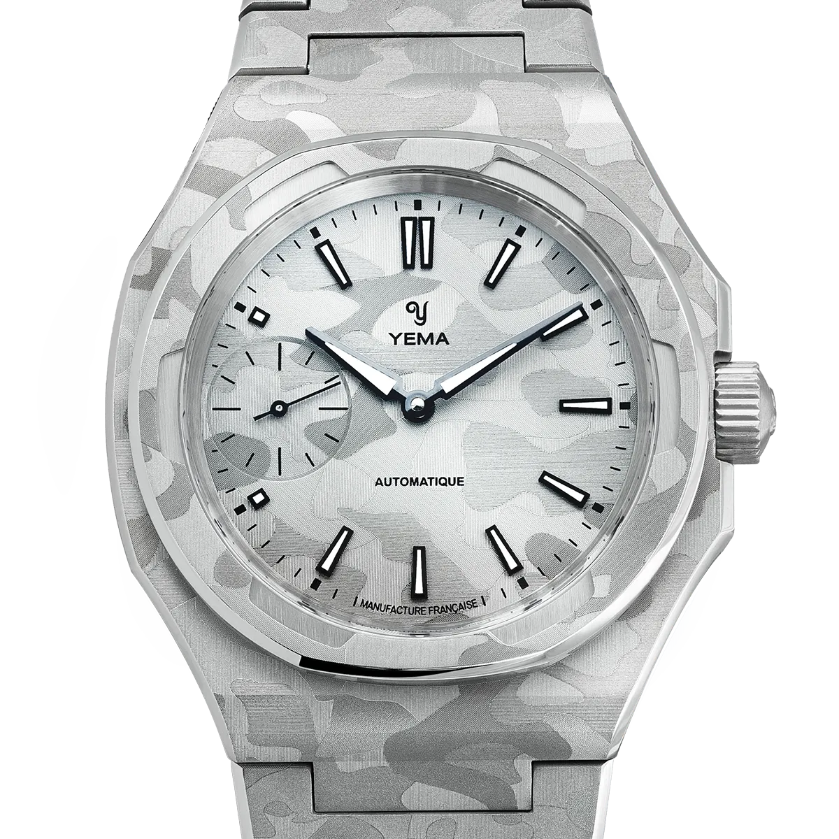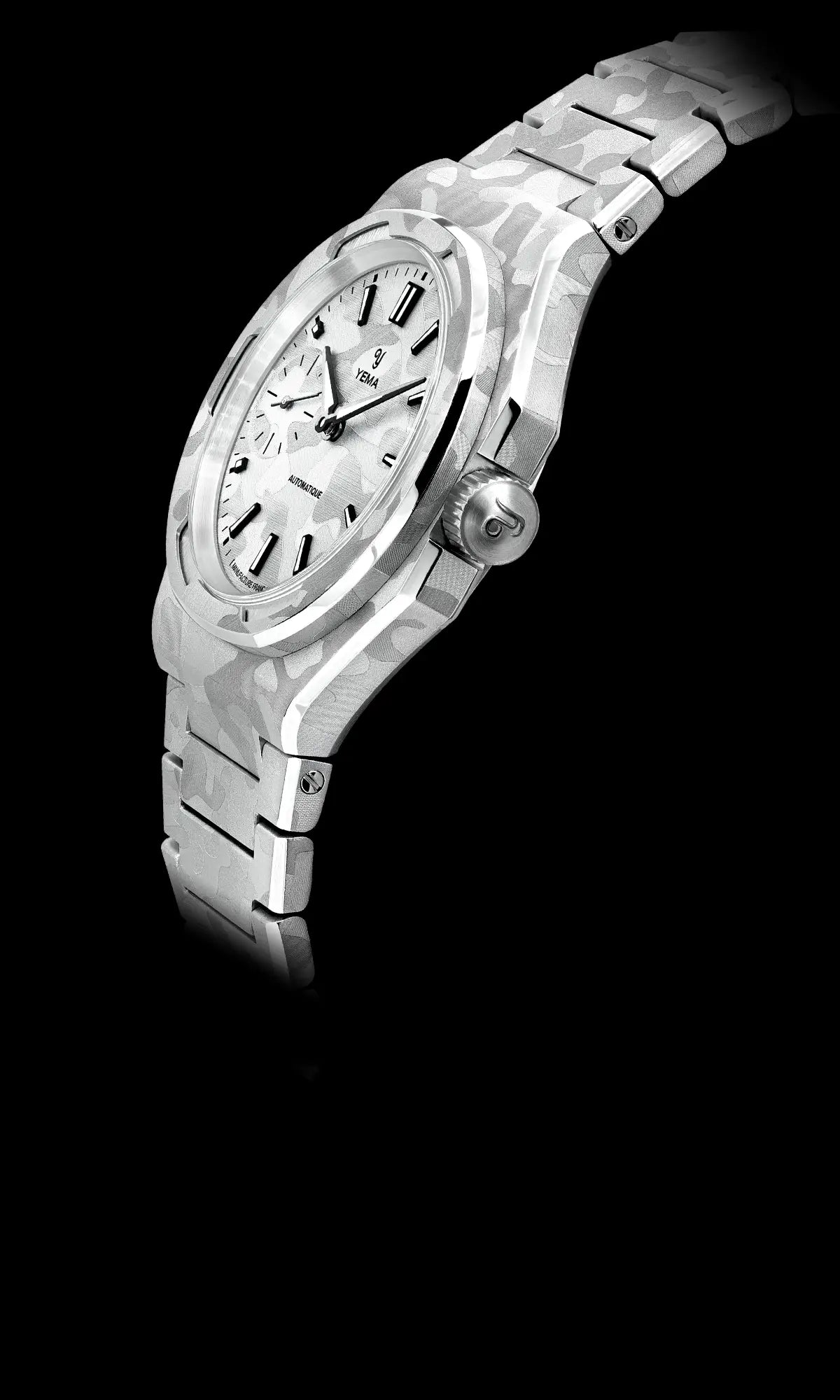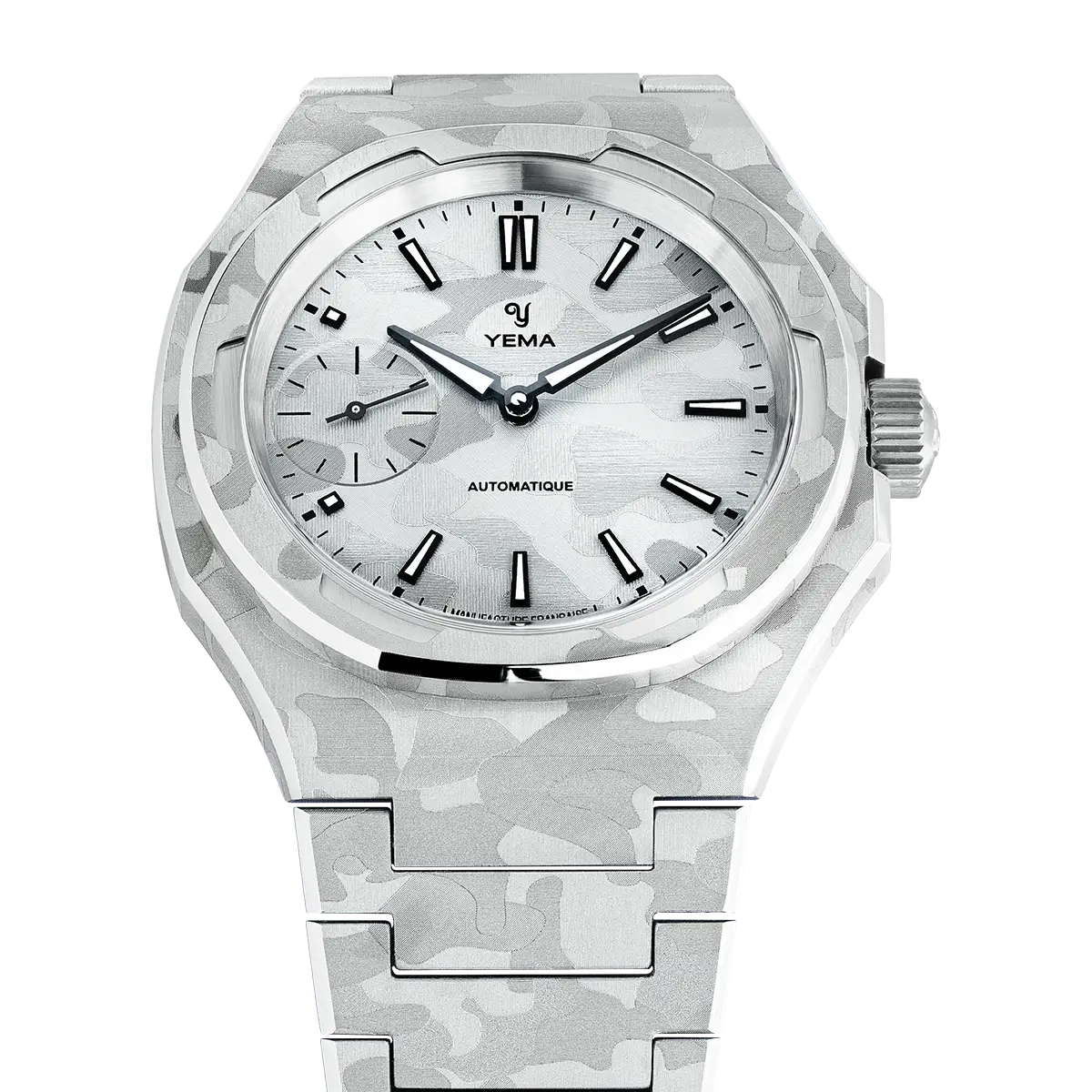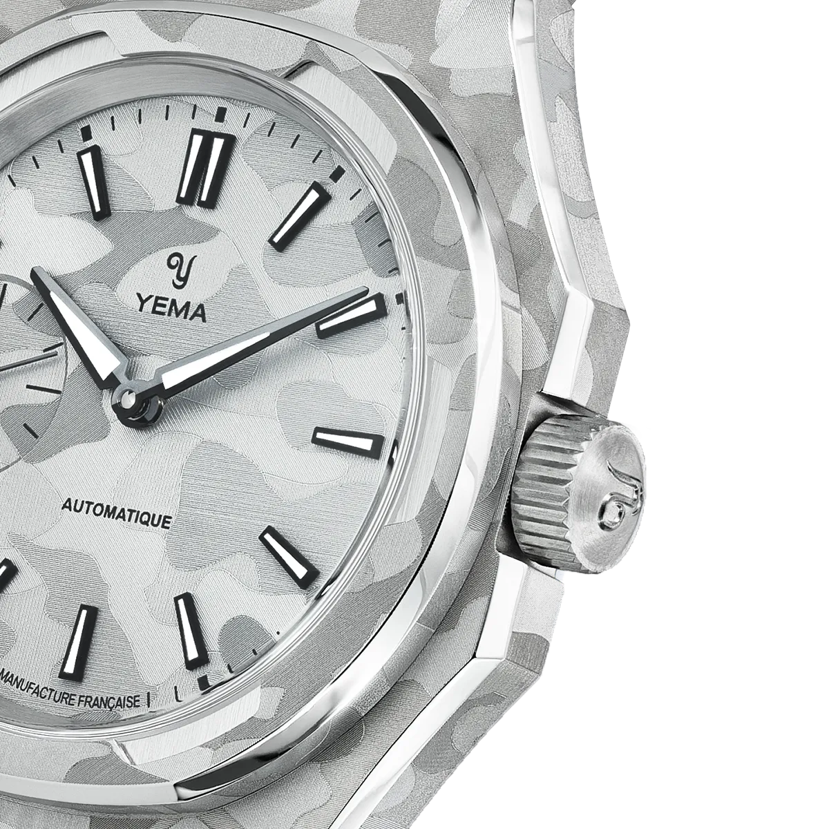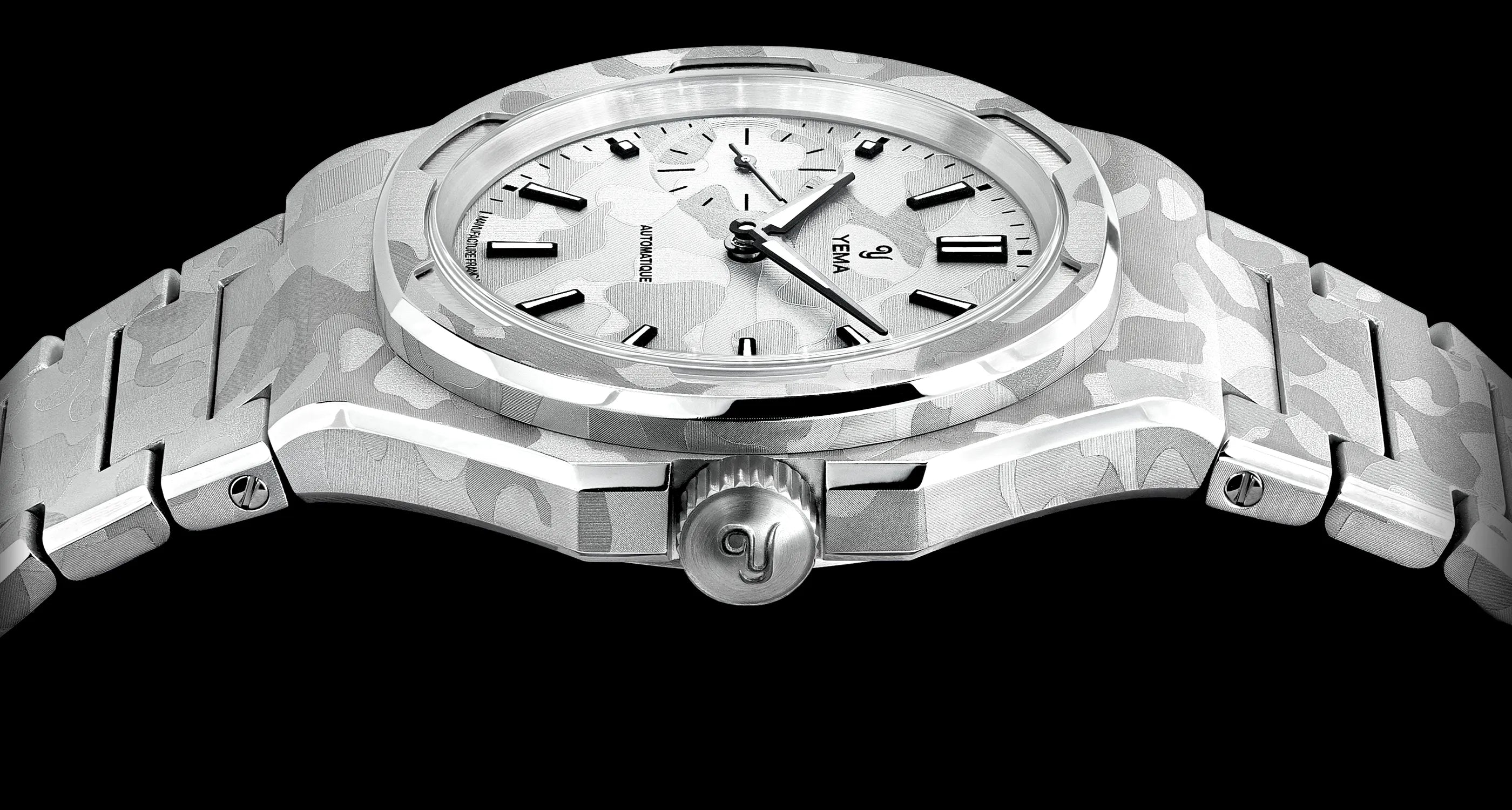 39mmのスチールケースは、複数の面とシャープな切り替えで構成された非対称の八角形フォルムを採用しています。この複雑なジオメトリーは、スノーカモフラージュのデザインを表現するのに最適なキャンバスとなり、スポーティな印象を損なうことなく、時計に独特の彫刻的な存在感を与えます。