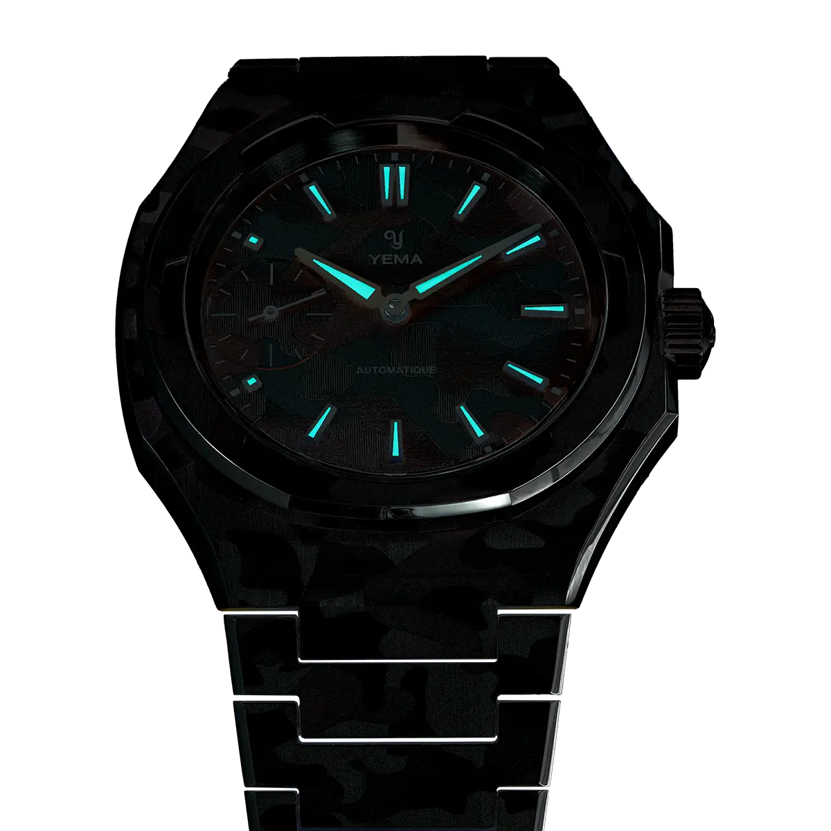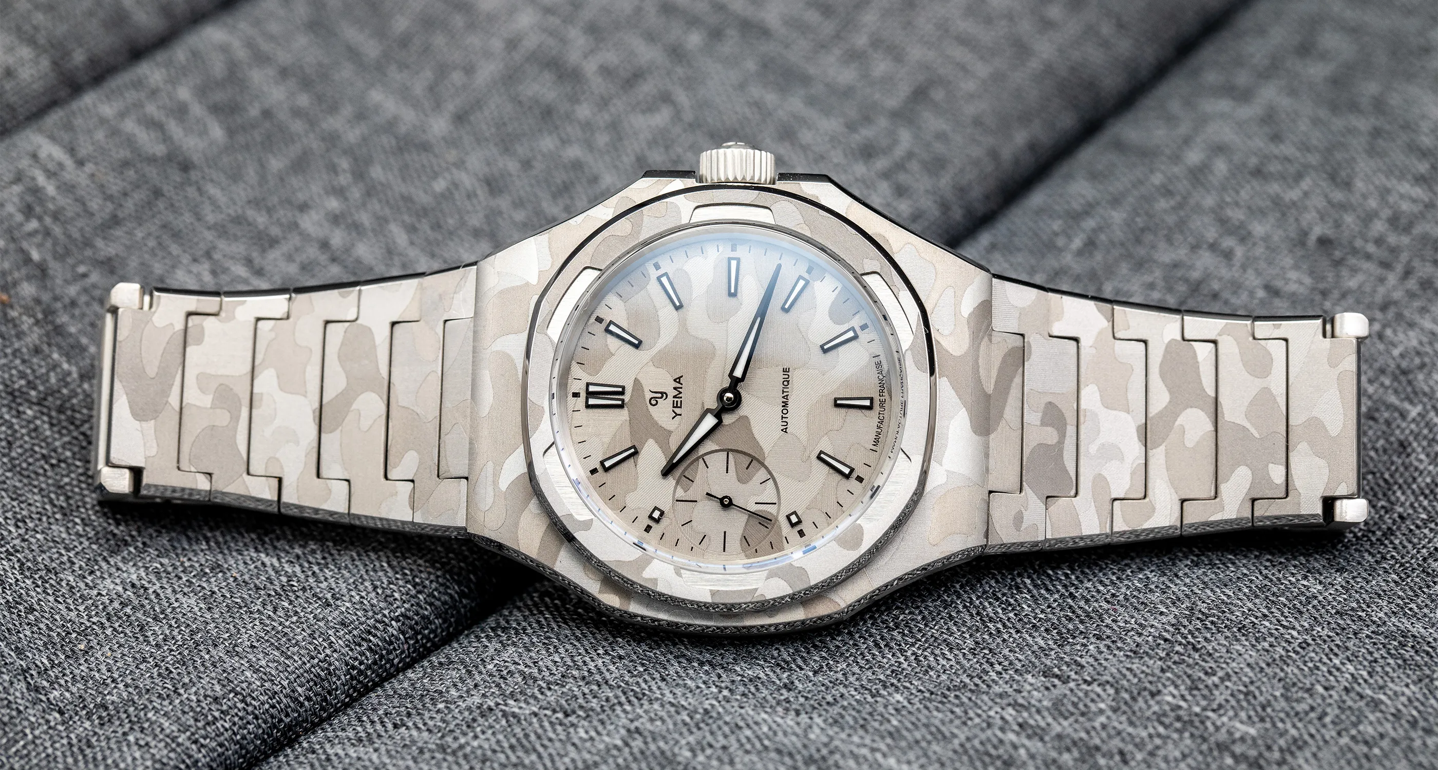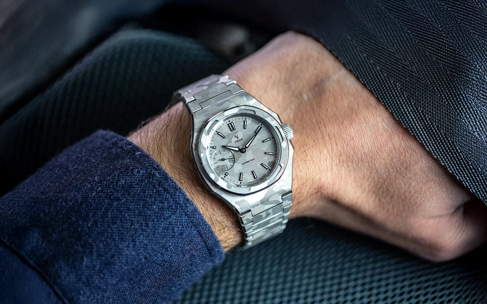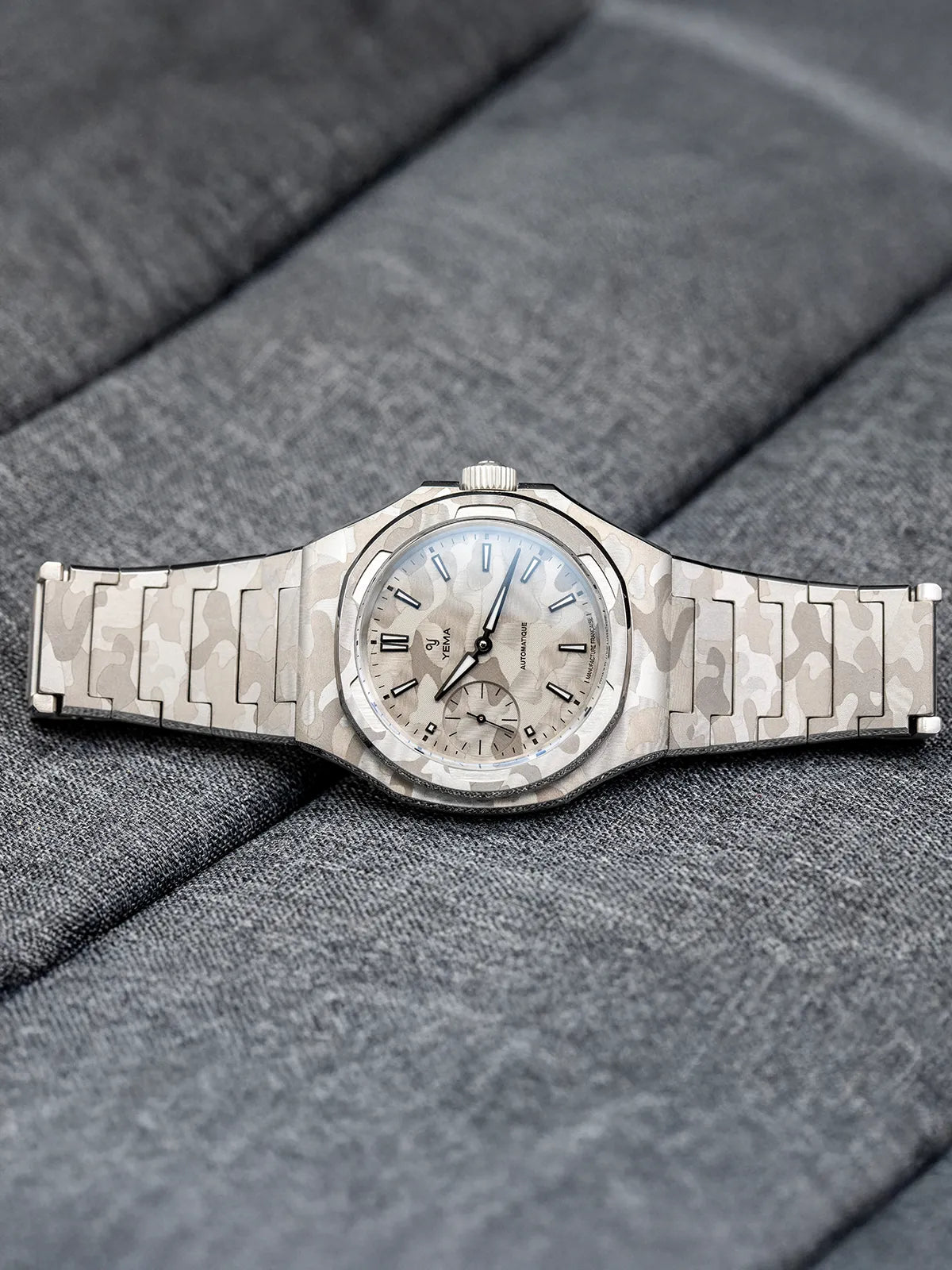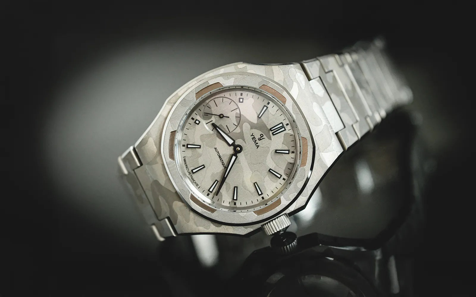 39mmのスチールケースは、複数の面とシャープな切り替えで構成された非対称の八角形フォルムを採用しています。この複雑なジオメトリーは、スノーカモフラージュのデザインを表現するのに最適なキャンバスとなり、スポーティな印象を損なうことなく、時計に独特の彫刻的な存在感を与えます。