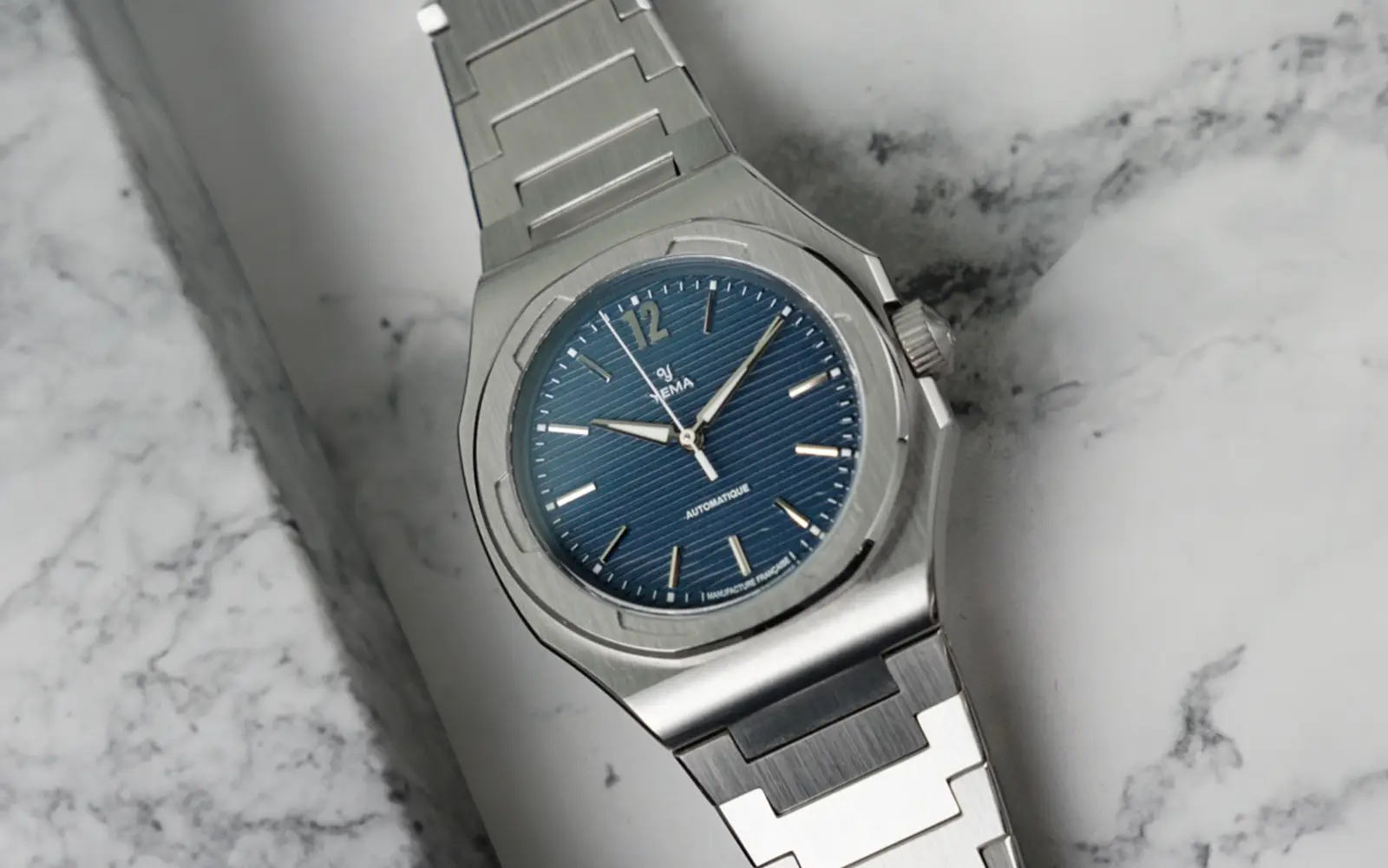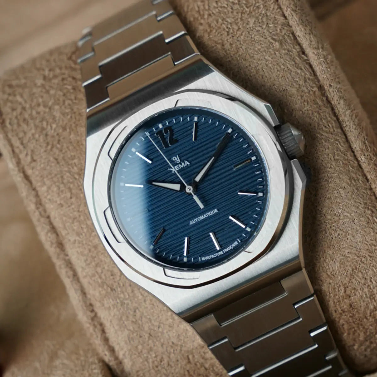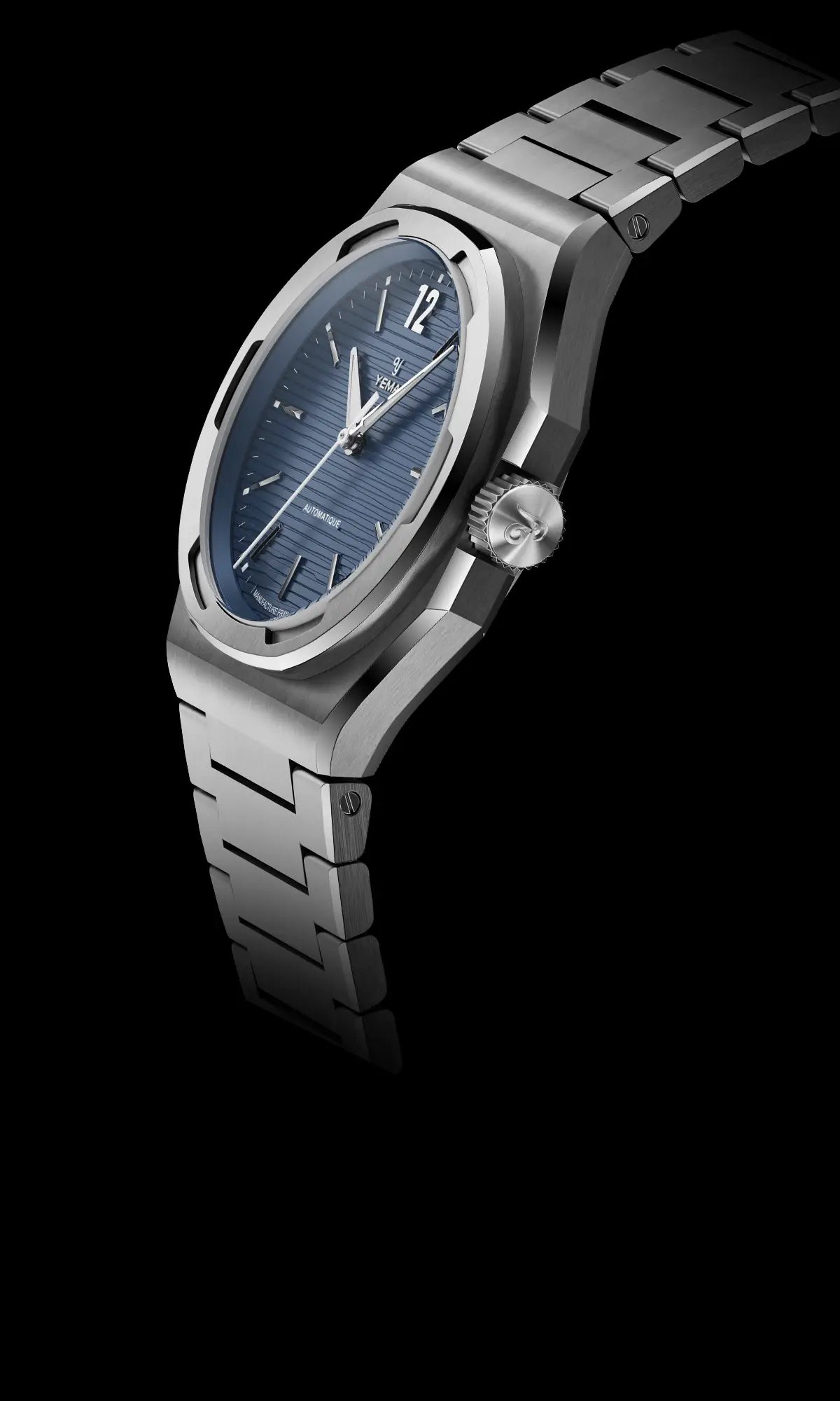 イエマのアイコニックなブレスレット一体型モデルが自社製マイクロローターキャリバーを搭載し、サイズがスリムダウンして再登場しました。エキジビションケースバックやファセット針にマッチした立体アワーマーカーに飾られたストライプ柄のダイヤルなど、こだわりにあふれた装飾が満載です。このエレガントなスポーツウオッチは日常使いに最適な現代性と快適性を提供します。