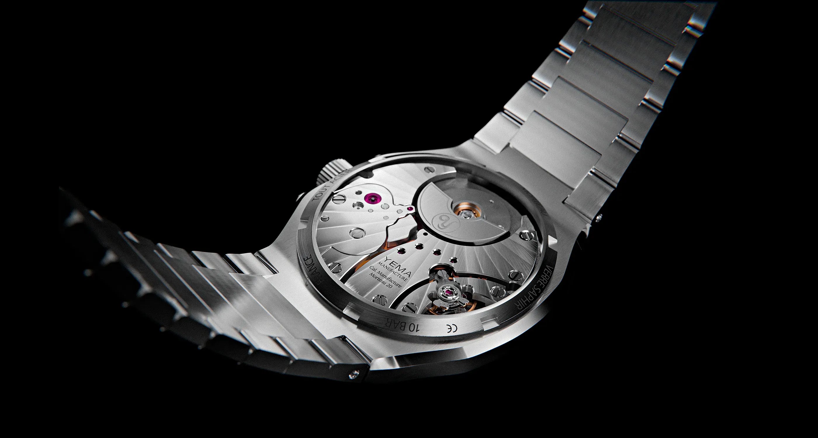 防水性能10BAR(100m)のサファイア製ケースバックからは、自社製キャリバーCMM.20マイクロローター・キャリバーの動きを眺めることが出来ます。ロジウムメッキされたブリッジはガルバニック加工された後にコート・ド・ジュネーブのサンレイ仕上げが施されており、ダイナミックで洗練された外観を提供します。ムーヴメントが回転するたびに生まれる光の反射がエレガントなきらめき効果をもたらし、あたかも表面が常に動き続けているような錯覚を起こさせます。