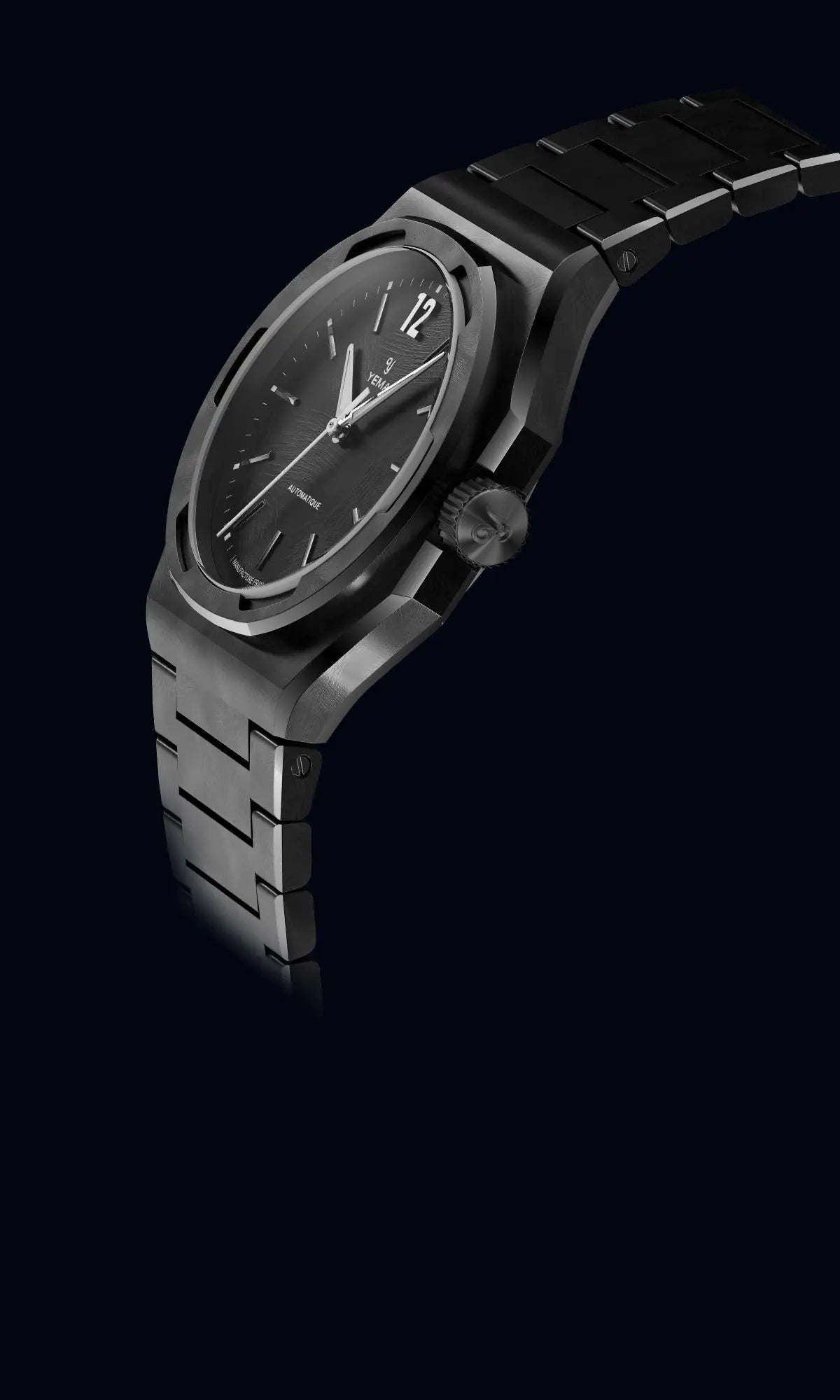 ベゼルのトップからケース、一体型のスティール製ブレスレットまでPVD加工とハンドブラッシュの表面とポリッシュ仕上げの側面が連続して続くデザインは、全体にシームレスで一体化した外観を提供します。このシームレスなデザインはとどまることなく一体型ブレスレットのテーパードリンクからダブルフォールディングクラスプに至るまでまで連続しています。