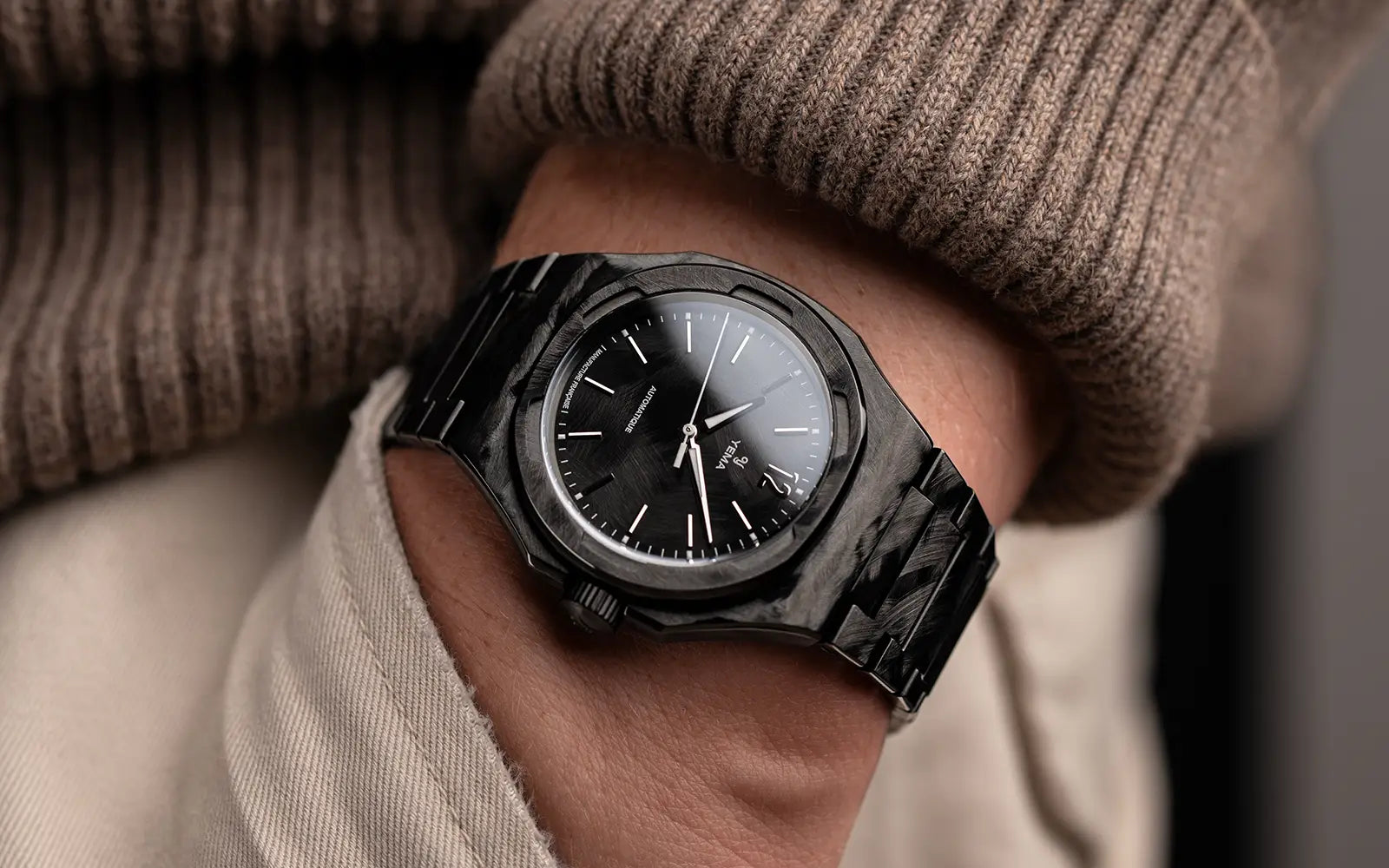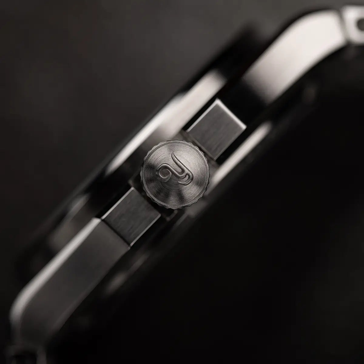 新しい形状のベゼルは1980年代のイエマ・スーマリーンモデルにインスピレーションされてデザインされました。一枚板のステンレススティールから作られており、ダイヤルとまったく同様にすべて手作業による仕上げが施されています。職人の一つ一つの繊細な手作業が、表面の質感と強度に微妙な変化をもたらします。このハンドブラッシュ仕上げの表面にPVDコーティング加工がされると、これらのディティールがさらに強調されて、あらゆる方向から光を集めて輝き始めます。まるで変化する光の遊びによる眩いばかりの景色を楽しんでいるかのような外観を提供します。