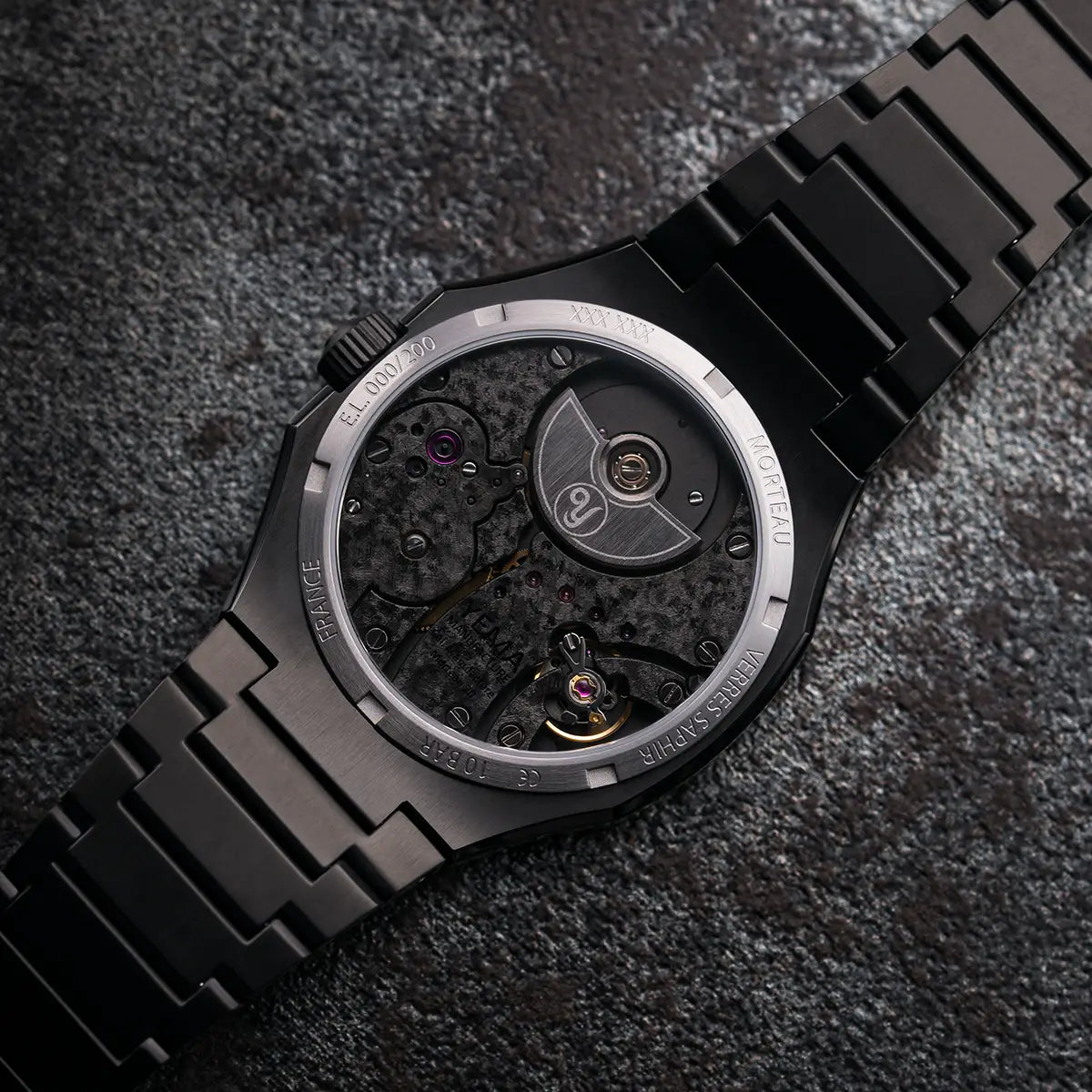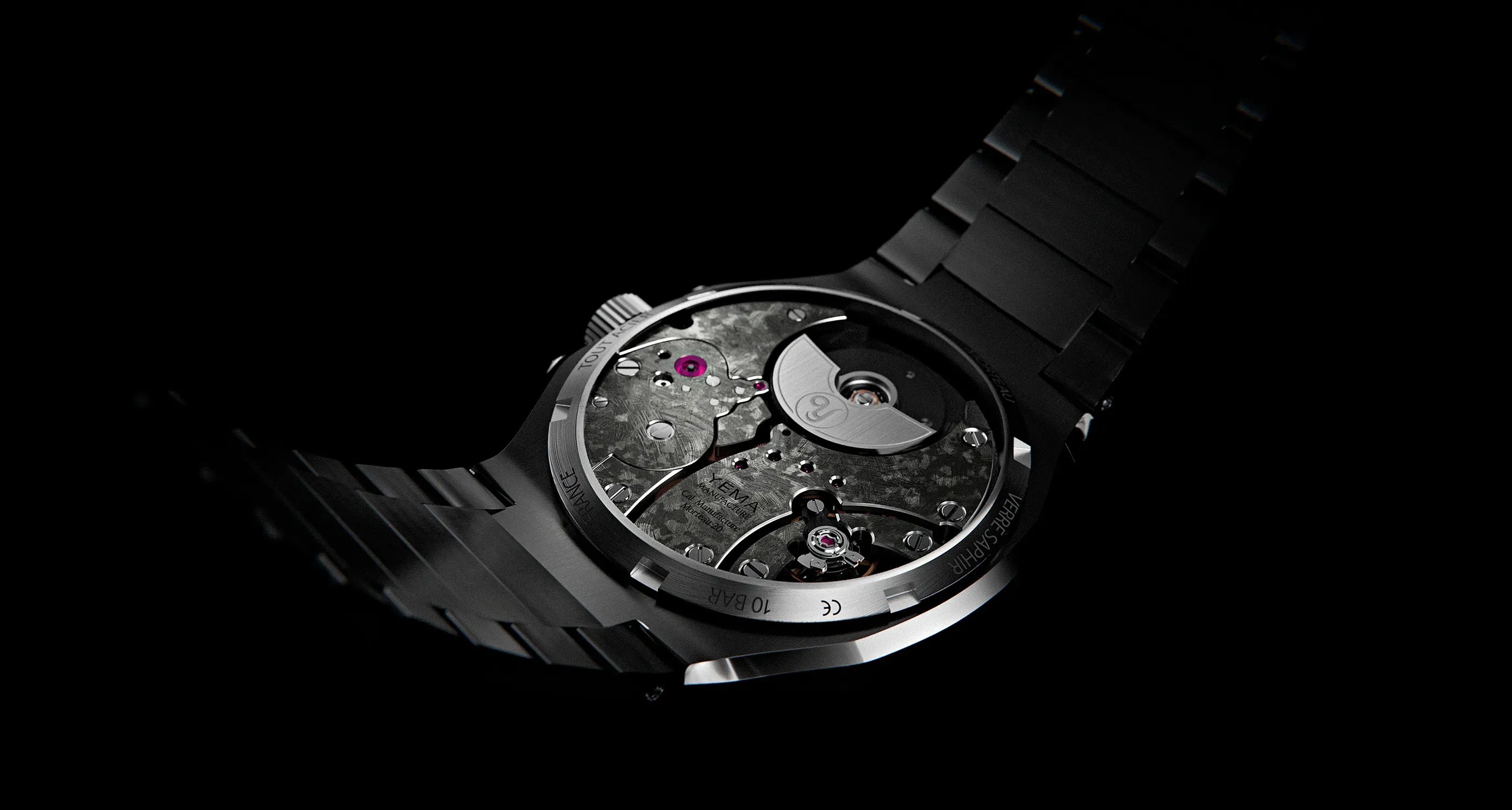 防水性能10BAR(100m)のサファイア製ケースバックからは、自社製キャリバーCMM.20マイクロローター・キャリバーの動きを眺めることが出来ます。それぞれのケースバックには5年間の国際保証書にも記載されている固有のシリアルナンバー(世界限定200本)が刻印されています。