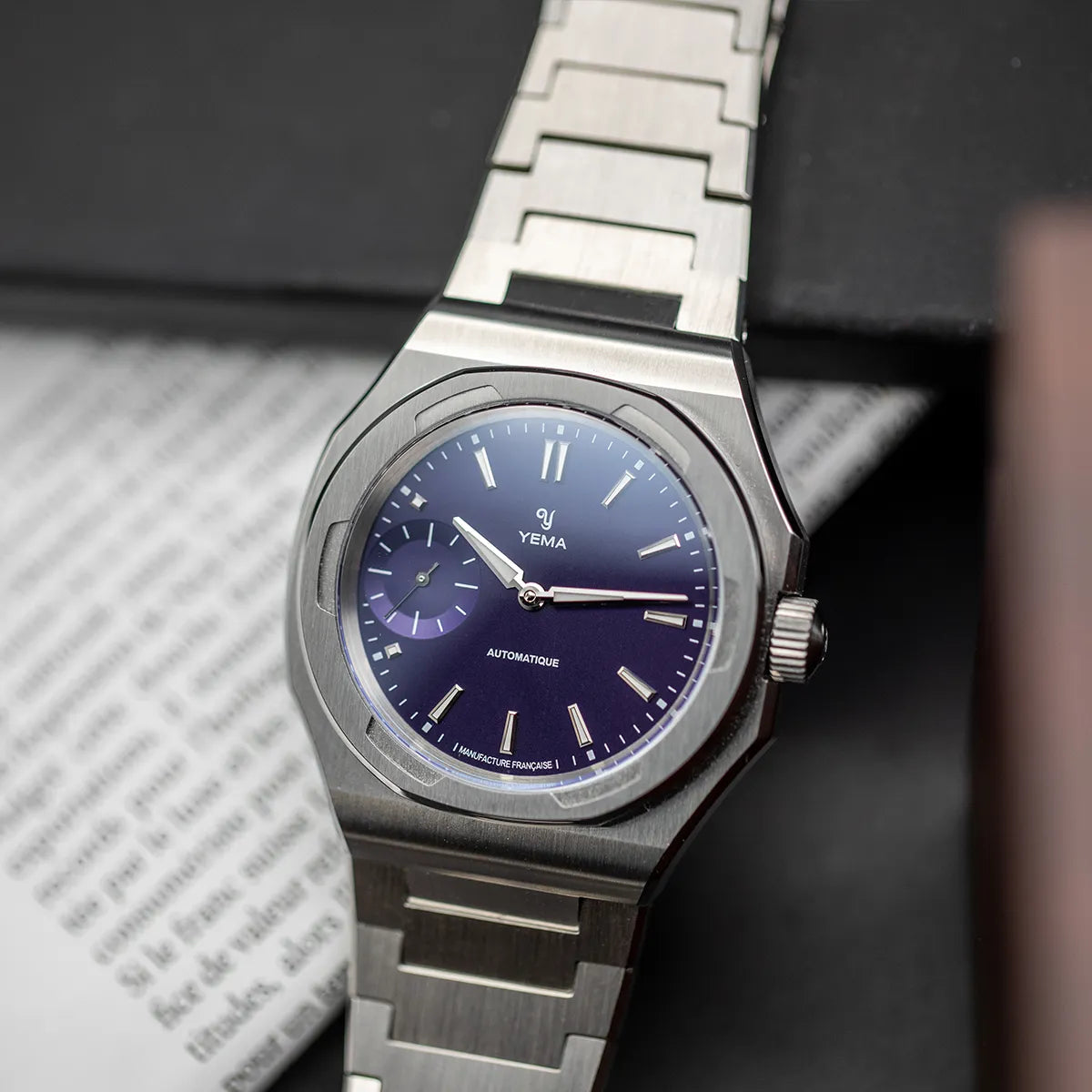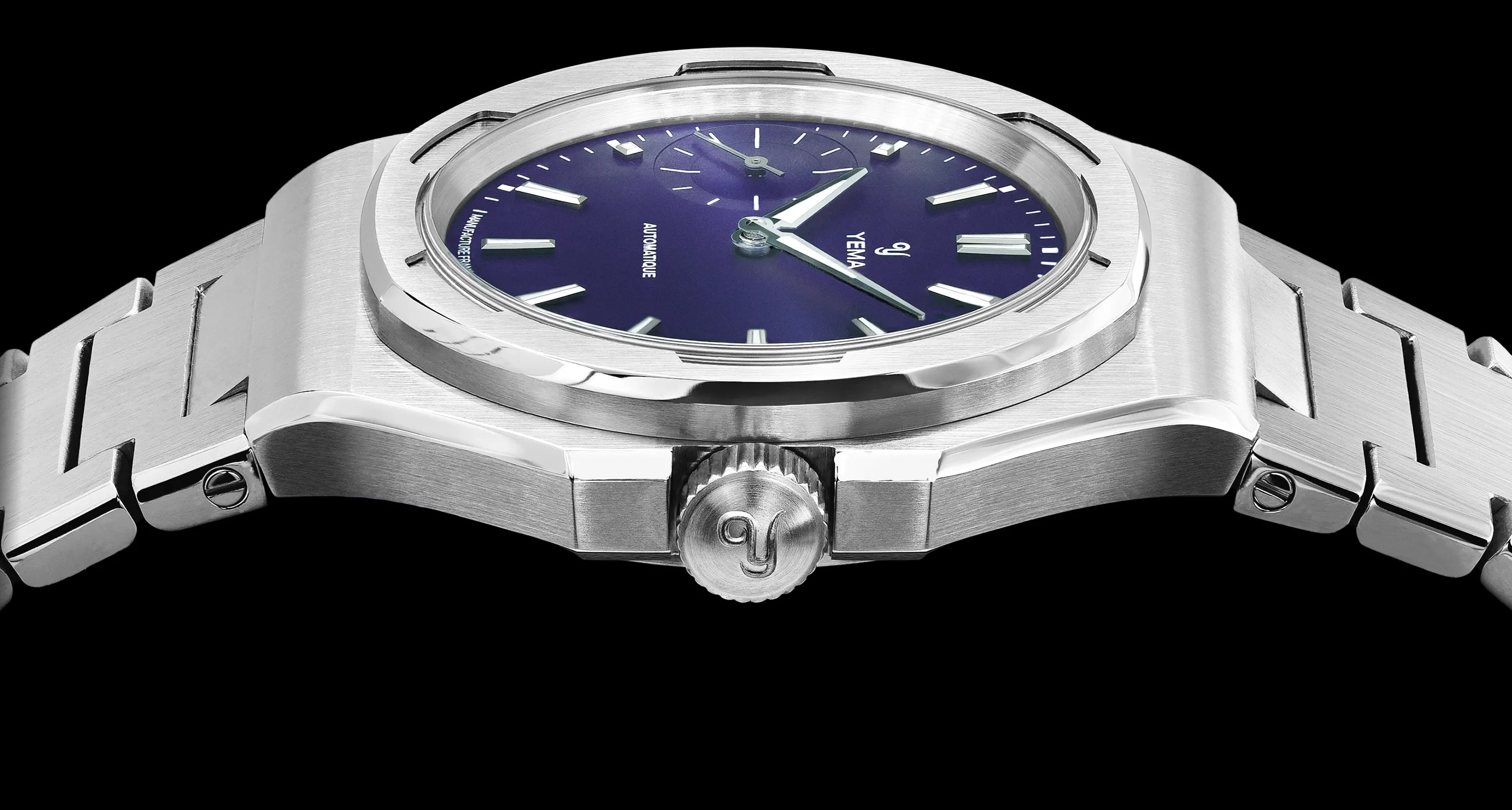 この新しいベゼルは、1980年代のYEMA Sous-Marineモデルにインスパイアされており、ステンレススチールの一体成型で作られています。それでいて、三つの異なる仕上げが施されており、上下のベベルには上品な縦方向のブラッシングが施され、水平面と垂直面が交わる部分は完全に鏡面仕上げで滑らかに移行しています。
