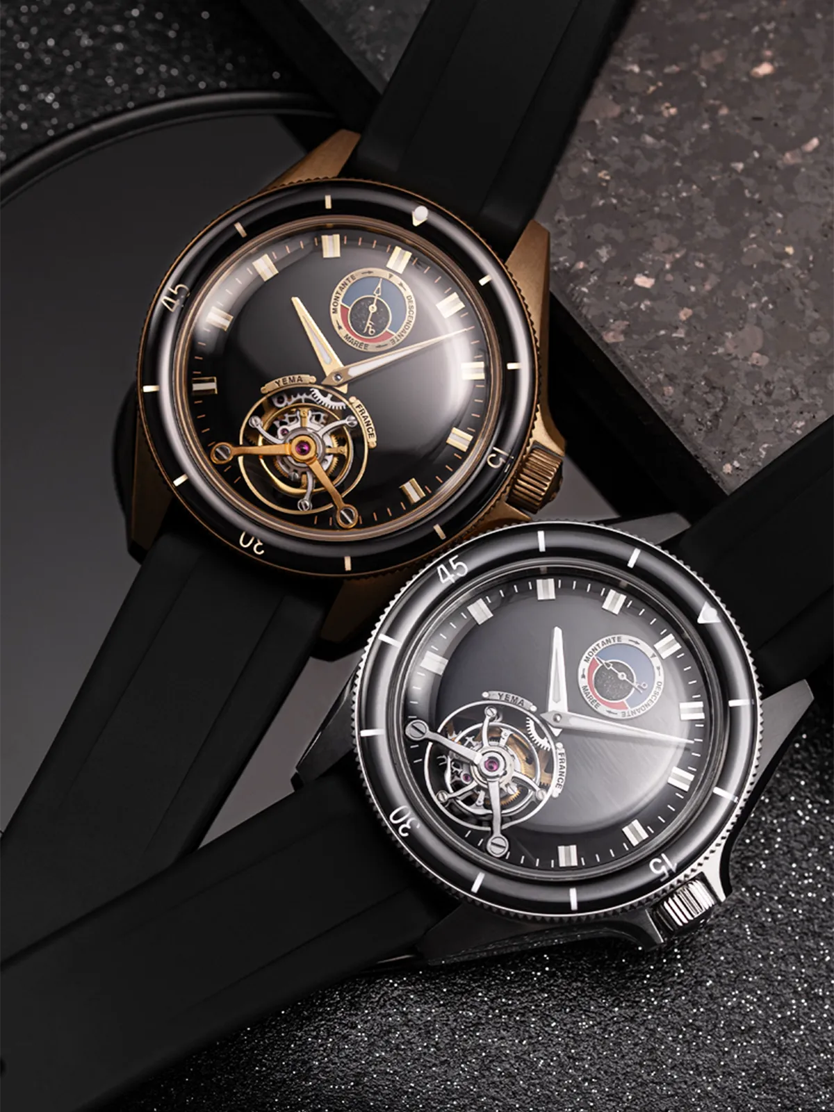 モルトーと私たちの工房近くのフランコースイスのジュラ渓谷で完全に設計および製造されたこのコレクターズ・タイムピースは、スティールとブロンズエディションの2択から選べるハイエンド仕上げで、限定75本の製品番号刻印入りです。この数字はイエマの75周年を記念するものであり又ウオッチメイキング・マニュファクチュールにおいて徐々に垂直統合を成し遂げてきた年月でもあります。