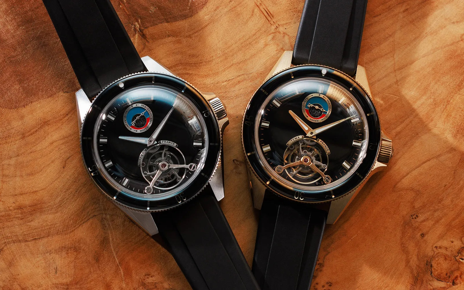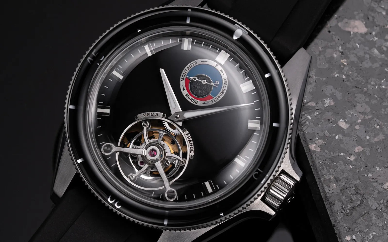 ダイアルは1970年代のヨッティングラフ・アイコニックモデルの美的コードからインスピレーションを受けてデザインされました。それはスーパールミノバでコーティングされたアプライドマーカーとブラックのサンレイ仕上げ、スモールハンドにイエマロゴが優雅にデザインされた潮汐インジケーター付きのレガッタスタイルのヨッティングラフ・ヴィンテージモデルを彷彿とさせるカラフルなマレオグラフレジスターを装備しています。部分的に開いたダイアルから眺める60秒間のトゥールビヨンのビートとターンの動的な光景には誰もが魅了されずにはいられません。