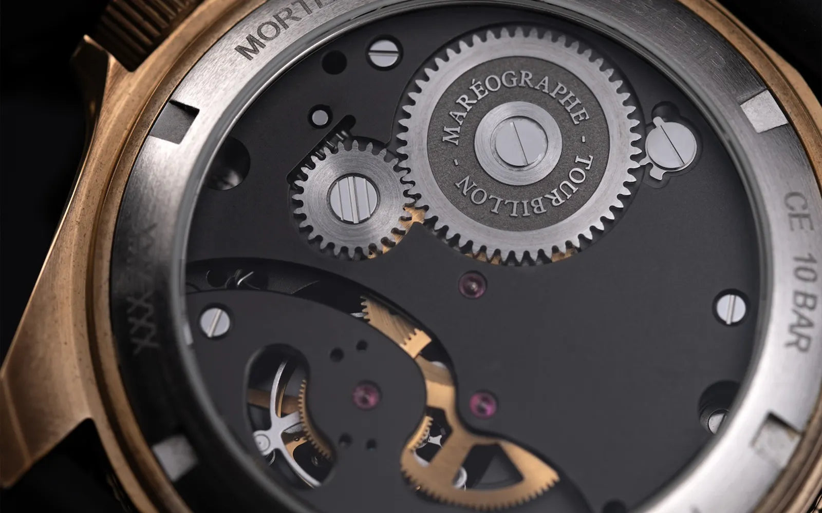 ウォッチケース、ダイアルと針を含むすべてのトゥールビヨンムーヴメントコンポーネントはモルトーの半径72km内に位置するフランスとスイスで、高級腕時計の製造に精通した職人によって製造されています。キャリバーのブリッジとメインプレートはすべてのコンポーネントの最終組み立てが行われるモルトーのイエマの工房で製造されています。